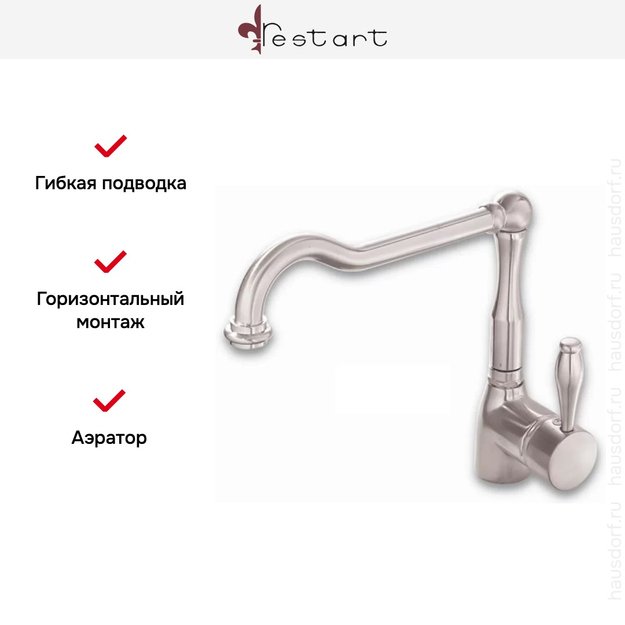 Изысканные формы смесителя RBR 008/NS дополнены элегантным цветовым исполнением. Модель из никеля с хромовым покрытием органично сочетается с любым интерьерным решением. Плавные изгибы и «королевские» формы — эксклюзив от Restart.