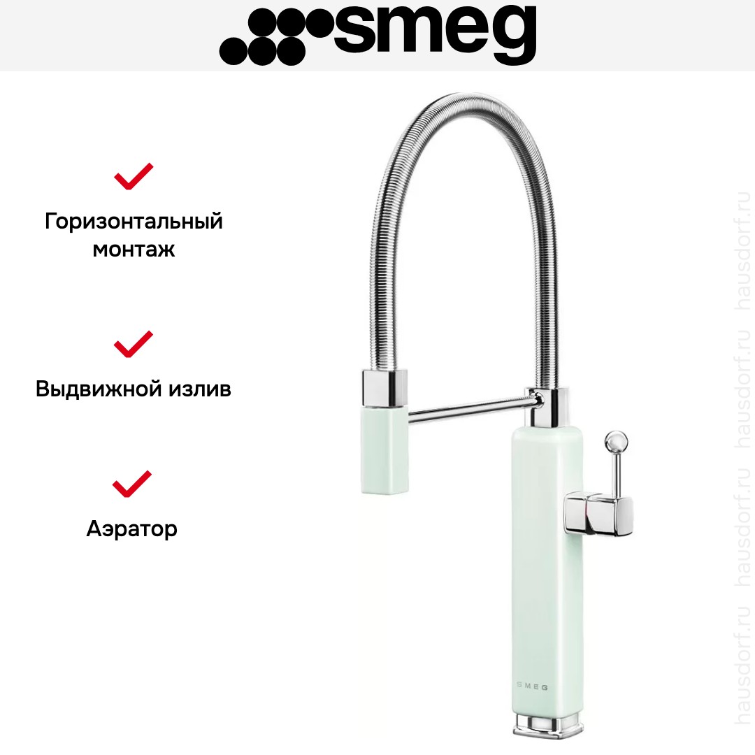 Смеситель Smeg в стиле 50-х годов пастельно-зеленого цвета подходит соответствующей линейке мелкой бытовой техники. Оснащен системами Water Saving Cartridge и Energy Saving Cartridge, которые экономят воду и энергию. Вы можете установить рычаг так, чтобы подавать только холодную воду в режиме, где обычно она смешивается 50/50.