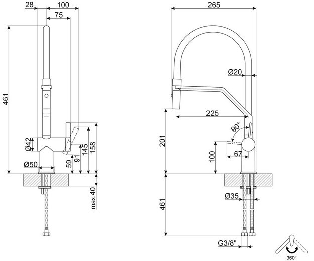 Горизонтальная установка привычна нам: смеситель устанавливается на краю мойки или столешницы. При вертикальной кран крепится на стену.