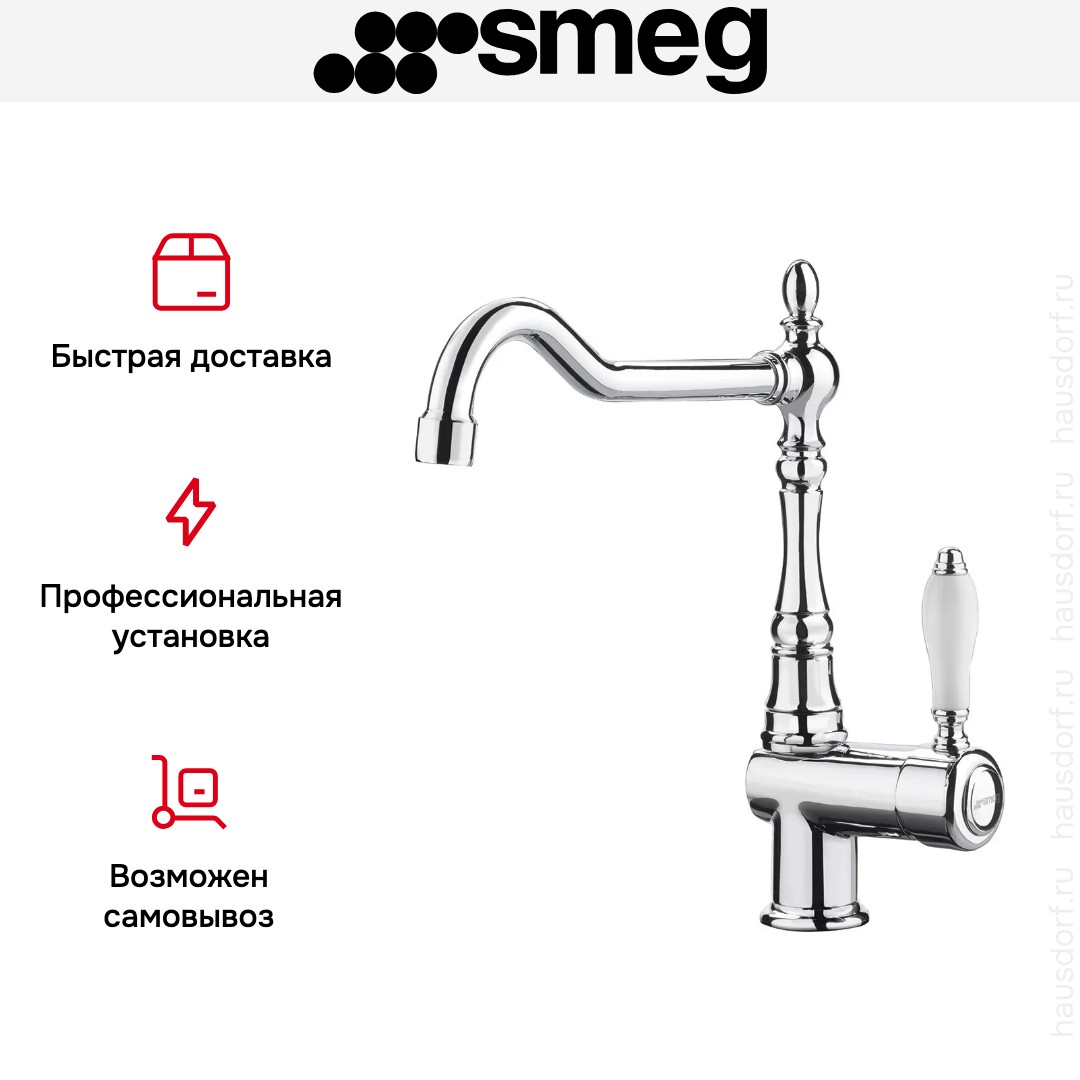 Однорычажный хромированный смеситель для кухни Smeg. Модель универсального цвета «хром» выполнена в ретро-стиле и подойдет для классического или кантри-интерьера. Функция ESC (Easy Saving Cartridge) предназначается для экономии горячей воды: в среднем положении рычага поступает холодная вода, а для получения горячей рычаг необходимо сдвинуть влево.