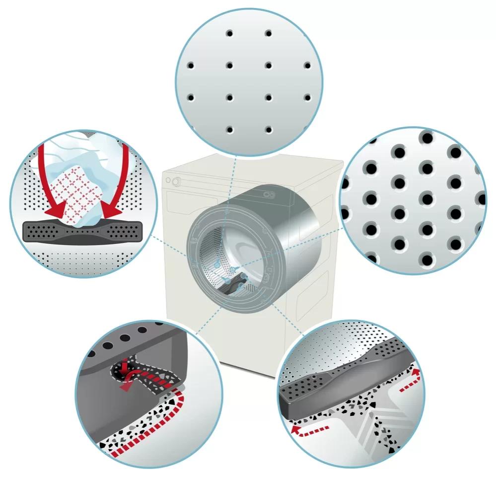 Перфорация на поверхности барабана может быть различной. Как правило, это отверстия, подобные отверстиям на поверхности обычной терки. Втягиваясь в них, белье очищается от грязи, однако особенностей конструкции быстро изнашивается. Гораздо более бережно удаляют загрязнения капельные барабаны с продолговатыми выпуклостями на поверхности, жемчужные с выступающими полусферами и сотовые с внутренней частью, покрытой выпуклыми шестиугольниками.