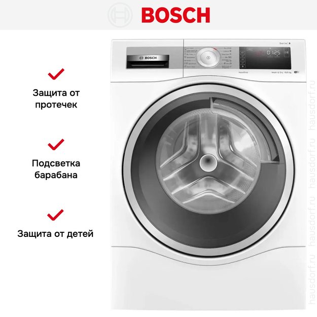 Стиральная машина Бош WDU8H542EU выпущена в стандартной конфигурации — устанавливается отдельно, поэтому рекомендуем заранее выделить для нее место в квартире. Благодаря классической фронтальной загрузке она привычна и удобна даже для тех, кто не очень разбирается в технике. В барабан помещается большое количество белья, что подойдет большим семьям или тем, кто часто стирает объемные вещи — постельное белье, верхнюю одежду. Максимальная загрузка: 10 кг.
