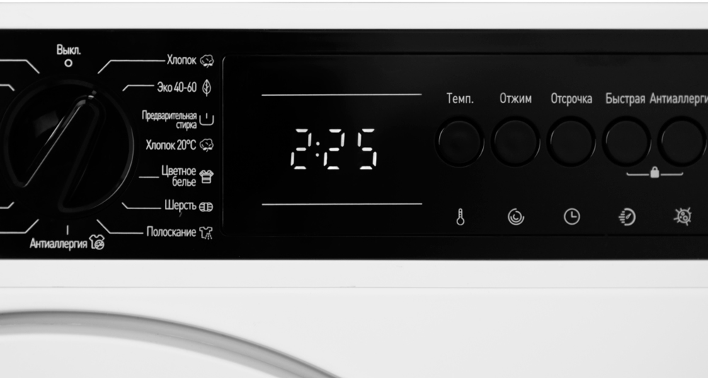 Достаточно простыми, но гораздо более информативными являются цифровые дисплеи, которые могут отображать числовую информацию и ограниченное количество символов. На таком дисплее, например, может отобразиться номер программы, скорость отжима, блокировка люка, отсрочка старта, температура воды, время, оставшееся до конца работы, символические обозначения действующих функций и прочая достаточно простая информация. Изображение может быть разного цвета — белого, зеленого или голубого, в любом оно будет хорошо заметно даже при отключенном освещении.