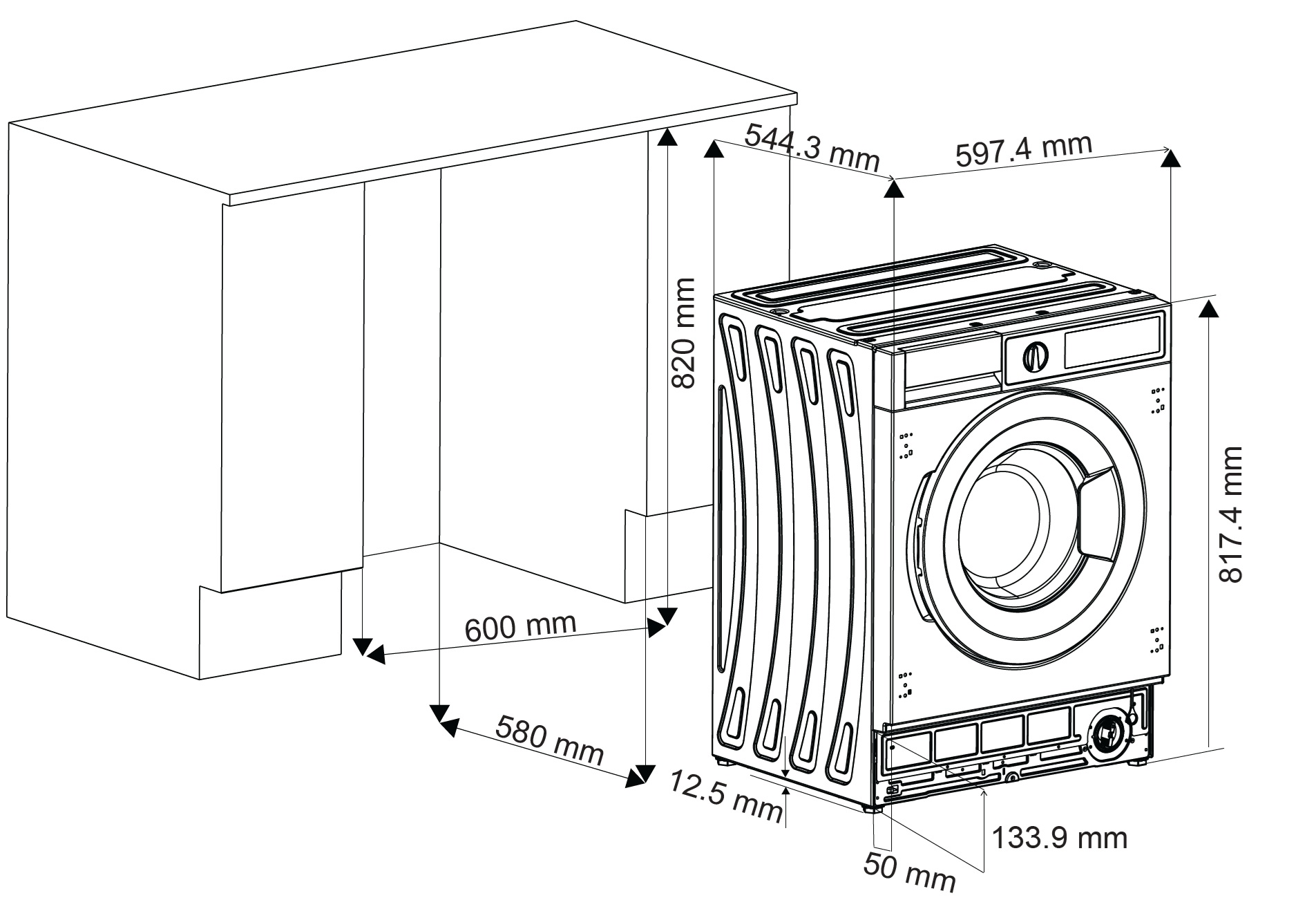 В отличие от другой встраиваемой техники, круглая дверца стиральных машин редко крепится к мебельному фасаду, она способна открываться отдельно. При размещении требуется оставлять зазор между задней стенкой машины и стеной помещения для свободного размещения шлангов. Нижняя часть стиралки закрывается цоколем, а верхняя — столешницей: крышку машины при этом иногда можно снять.