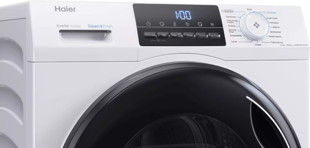 Эта модель — комбинация стирки и сушки, что полезно людям, которые не могут или не хотят приобретать отдельно сушильную машину, при этом в квартире нет балкона или лоджии, чтобы с комфортом сушить одежду на веревках. Вы можете отложить запуск, если хотите сэкономить на тарифах и включить машинку ночью, либо если планируете развесить белье сразу после возвращения работы и не ждать, пока закончится цикл. На панели управления отображаются разнообразные индикаторы, чтобы было проще следить за процессом, например: температуры стирки, скорости отжима, времени до окончания стирки, выбранной программы, сушки, отсрочки старта. Скорость отжима достигает 1400 оборотов в минуту. Функцию отжима можно будет отключить вручную, если она вам не нужна.