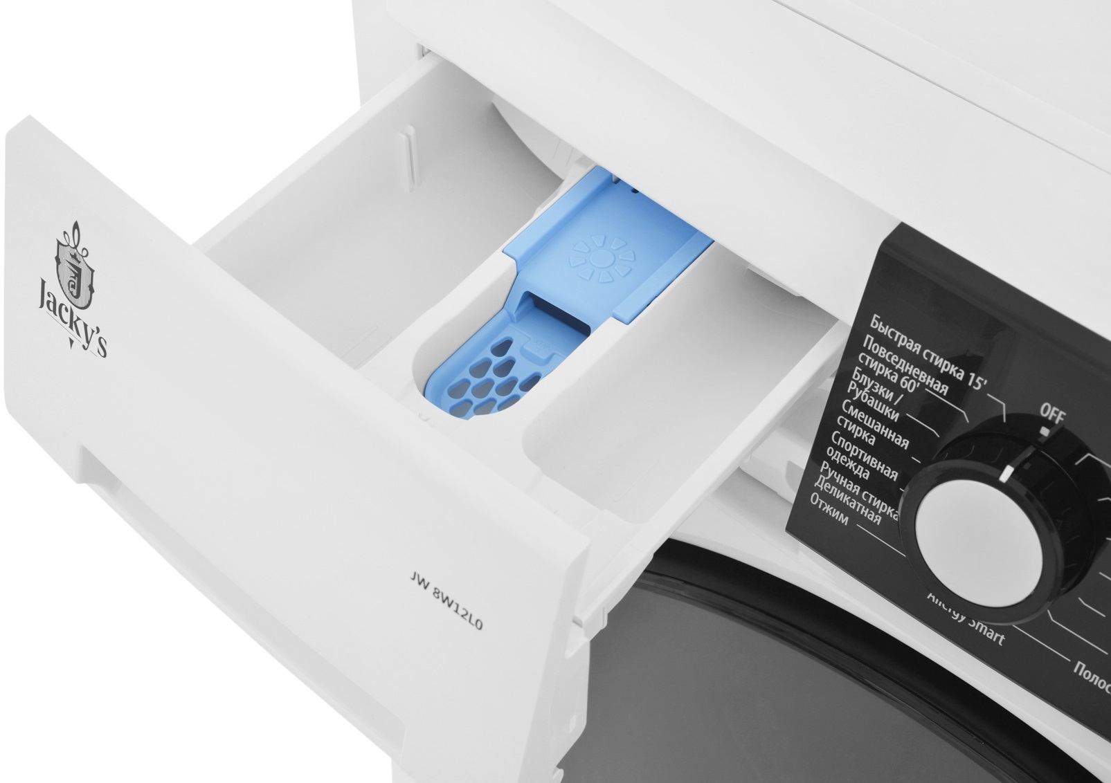 Jacky’s JW 8W10L0 — отдельностоящая стиральная машина с максимальной загрузкой 8 кг. Имеет стандартные габариты, поэтому подойдет владельцам средних или больших ванных комнат. Классический дизайн корпуса делает эту модель универсальной.