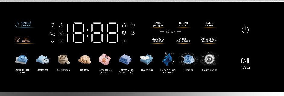 Вы можете отложить запуск, если хотите сэкономить на тарифах и включить машинку ночью, либо если планируете развесить белье сразу после возвращения работы и не ждать, пока закончится цикл. На панели управления отображаются разнообразные индикаторы, чтобы было проще следить за процессом, например: времени до окончания стирки, выбора дополнительных функций, блокировки дверцы, блокировки от детей, отсрочки старта. Скорость отжима достигает 1200 оборотов в минуту. Функцию отжима можно будет отключить вручную, если она вам не нужна.