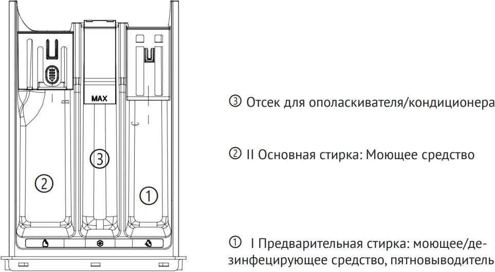 Диспенсер для моющих средств стиральной машины предназначен для правильного и своевременного дозирования жидкого средства для стирки и кондиционера, которые используются при ополаскивании.