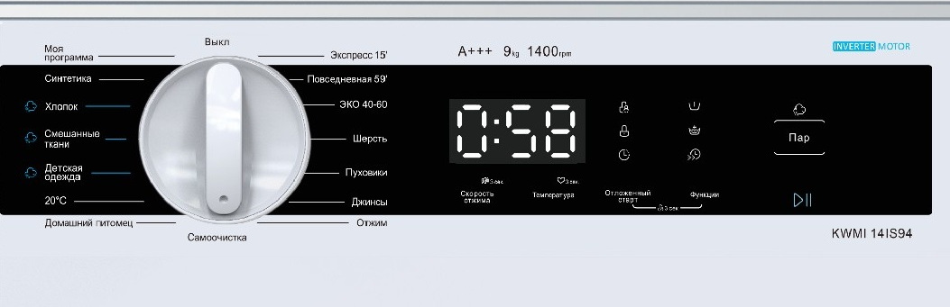 Электронное управление удобно и понятно. Для выбора программ используются сенсорные кнопки, поворотный программатор. Количество режимов для стирки разных типов белья: 16.