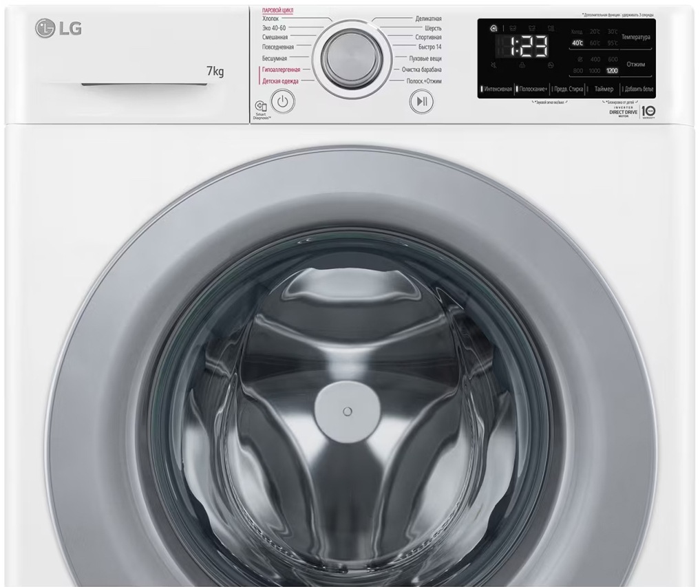 Цвет этой стиральной машинки — белый. Мотор: Инверторный. Благодаря ему машина работает тише, потребляет меньше электроэнергии, сохраняя при этом необходимую мощность.