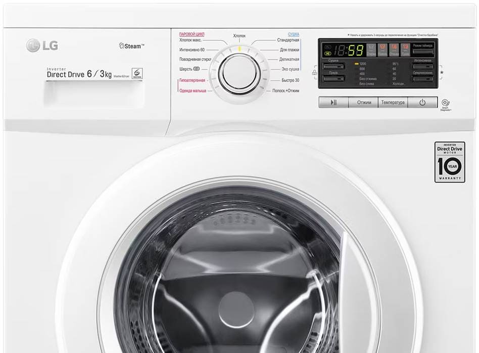 Эта модель — комбинация стирки и сушки, что полезно людям, которые не могут или не хотят приобретать отдельно сушильную машину, при этом в квартире нет балкона или лоджии, чтобы с комфортом сушить одежду на веревках. Вы можете отложить запуск, если хотите сэкономить на тарифах и включить машинку ночью, либо если планируете развесить белье сразу после возвращения работы и не ждать, пока закончится цикл. На панели управления отображаются разнообразные индикаторы, чтобы было проще следить за процессом, например: хода программы, температуры стирки, скорости отжима, выбора дополнительных функций, выбранной программы, сушки, отсрочки старта. Скорость отжима достигает 1200 оборотов в минуту. Функцию отжима можно будет отключить вручную, если она вам не нужна.
