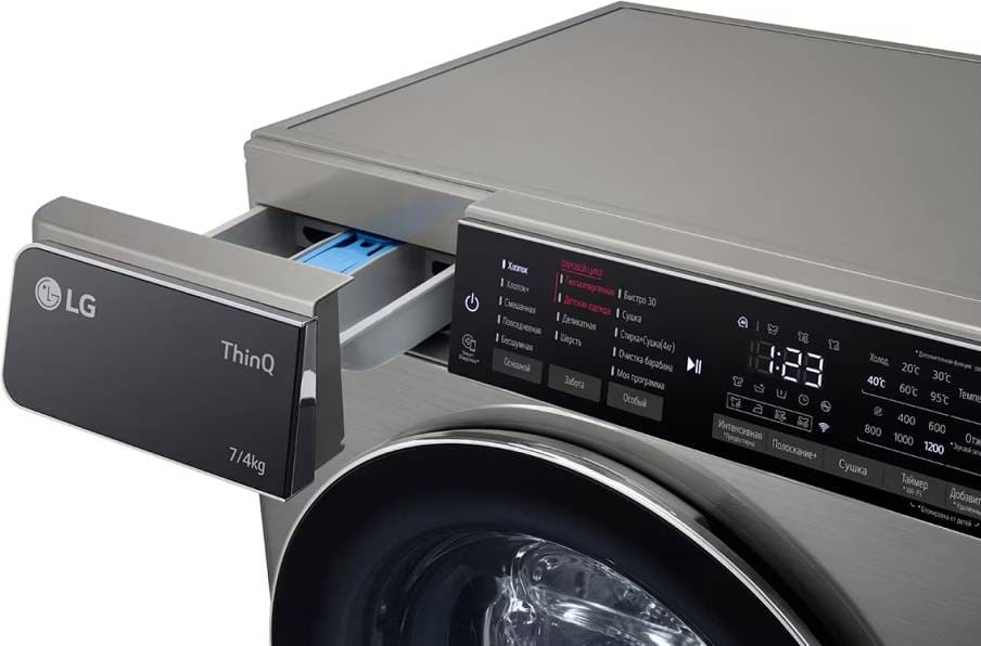 Эта модель — комбинация стирки и сушки, что полезно людям, которые не могут или не хотят приобретать отдельно сушильную машину, при этом в квартире нет балкона или лоджии, чтобы с комфортом сушить одежду на веревках. Вы можете отложить запуск, если хотите сэкономить на тарифах и включить машинку ночью, либо если планируете развесить белье сразу после возвращения работы и не ждать, пока закончится цикл. На панели управления отображаются разнообразные индикаторы, чтобы было проще следить за процессом, например: хода программы, температуры стирки, скорости отжима, времени до окончания стирки, выбора дополнительных функций, блокировки дверцы, выбранной программы, включения и выключения, старт/пауза, отсрочки старта, дополнительного полоскания. Скорость отжима достигает 1200 оборотов в минуту. Функцию отжима можно будет отключить вручную, если она вам не нужна.