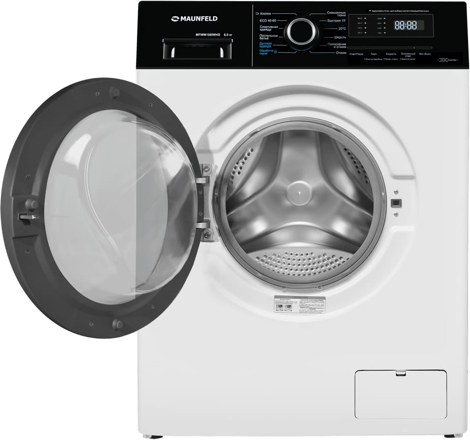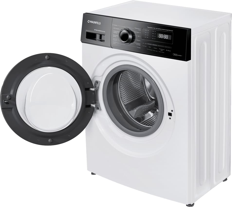 Стиральная машина Маунфилд MFWM106IWHD выпущена в стандартной конфигурации — устанавливается отдельно, поэтому рекомендуем заранее выделить для нее место в квартире. Благодаря классической фронтальной загрузке она привычна и удобна даже для тех, кто не очень разбирается в технике. За счет небольшой глубины данную модель предпочитают владельцы небольших квартир, студий. В барабан помещается не так много вещей за один раз, но тем, кто не любит копить вещи или просто мало стирает, будет достаточно. Максимальная загрузка: 6 кг.