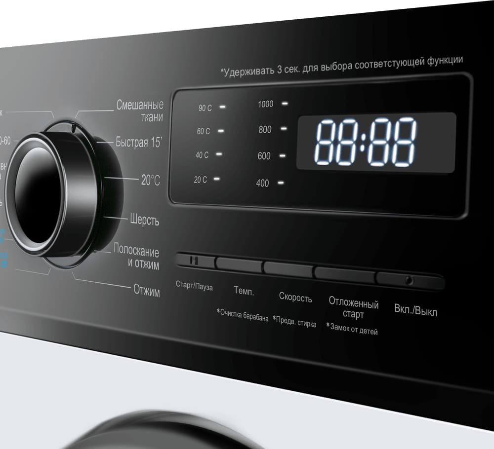 Вы загружаете белье, выбираете программу, задаете параметры и выставляете таймер для удобной работы.