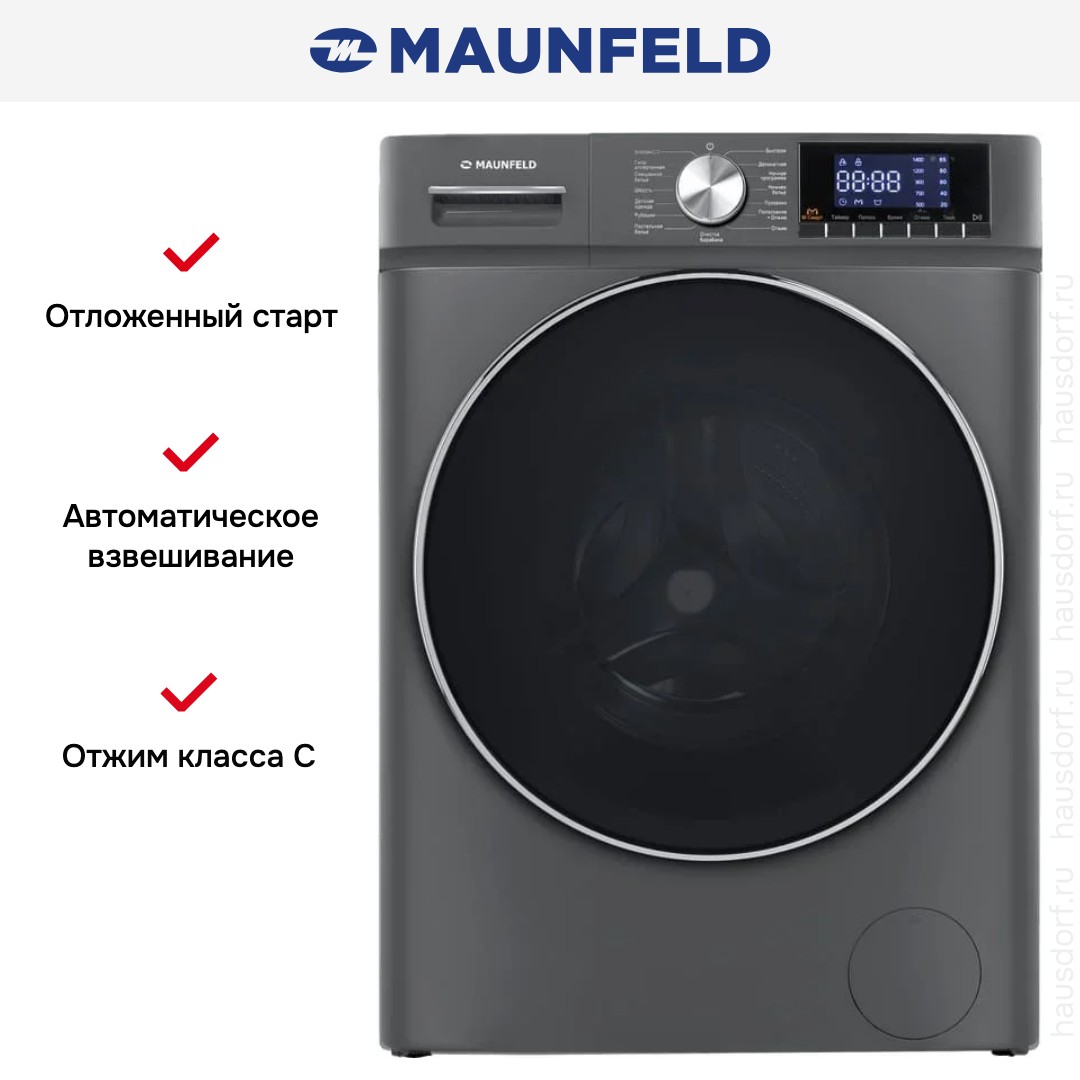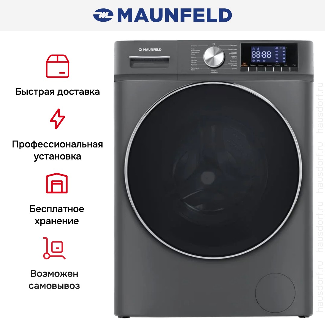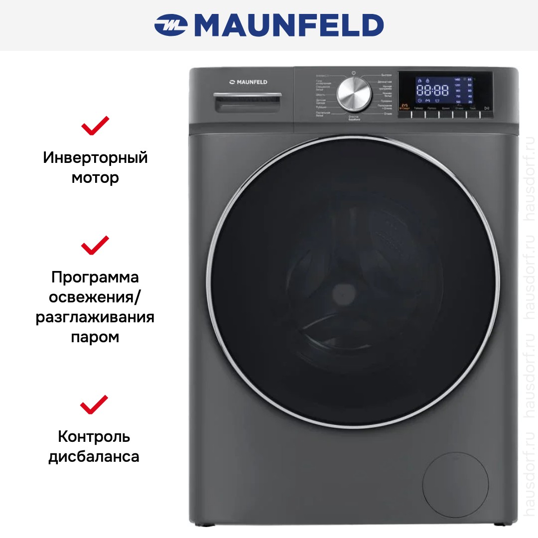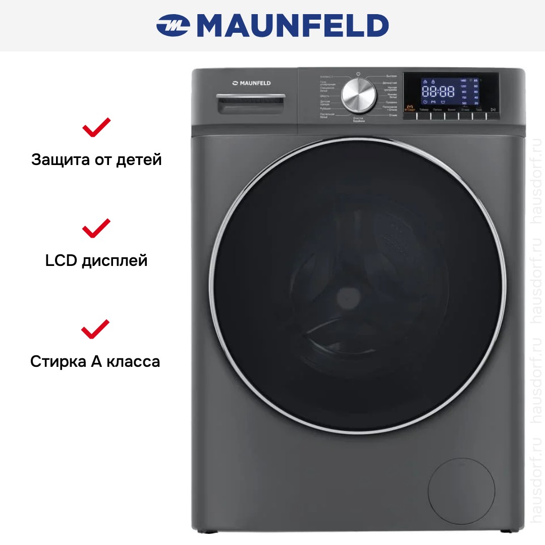 Стиральная машина Maunfeld MFWM127ISB02 — элегантное и функциональное решение для дома, где важны компактность, надежность и широкий набор возможностей. Корпус в графитовом оттенке сочетается с черным люком большого диаметра 43.9 см, что подчеркивает современный стиль и облегчает загрузку белья; дверь открывается на 135°, а при полностью распахнутом створке глубина достигает 96.5 см, поэтому устройство удобно эксплуатировать даже в ограниченном пространстве. При габаритах 85.3×59.5×50.5 см прибор вмещает до 7 кг одежды, а барабан объемом 64 литра изготовлен из нержавеющей стали и рассчитан на длительную эксплуатацию без коррозии; внутренний бак стальной, что увеличивает устойчивость к механическим нагрузкам. Электронная панель с поворотным программатором, кнопками и цифровым дисплеем обеспечивает интуитивное управление: на экране отображаются температура, скорость отжима, оставшееся время и выбранные дополнительные опции, а прямая панель упрощает доступ ко всем элементам. Инверторный мотор гарантирует экономичную работу и низкий износ, при этом максимальная частота центрифуги — 1200 об/мин с возможностью отключения или регулировки оборотов под тип ткани. Набор режимов включает 16 циклов для самых разных задач: обычные для хлопка и смешанного белья, деликатные — ручная стирка, шерсть, рубашки и тонкие вещи, специальные для постельных принадлежностей и изделий из пуха, экспресс-программы для быстрой ежедневной обработки, а также гигиеническая стирка против аллергенов. Для дополнительного ухода предусмотрены функции полоскания, обработка детских вещей, ночной режим с пониженным шумом, паровая сессия для освежения и разглаживания, а также опция One Touch для быстрой связи со смартфоном. Удобство эксплуатации повышается за счет автоматического взвешивания загрузки, возможности стирки холодной водой и опции дополнительного полоскания; есть режим очистки барабана для поддержания гигиены и предотвращения запахов. Таймер отсрочки старта на 1-24 часа позволяет планировать циклы под ваш расписание, а индикаторы и блокировки — дверцы и детская защита — обеспечивают безопасность. Прибор оснащен системой контроля пенообразования и дисбаланса, защитой от перелива и перегрева, а также автоматикой для обнаружения неисправностей, что упрощает диагностику. В техническом плане машина экономична: класс стирки A, класс отжима C и энергоэффективность A+++, при потреблении около 0.763 кВт·ч за цикл и расходе воды около 50 л на цикл; годовые показатели отражают бережное отношение к ресурсам. Уровень шума при стирке составляет 62 дБ, при отжиме — 76 дБ, масса устройства 52 кг, в комплекте три отделения для моющих средств, а сетевой кабель длиной 150 см обеспечивает удобство подключения. Практичные детали, такие как ножки для регулировки высоты, прочные материалы и продуманная эргономика управления, делают эту модель универсальным выбором для семей, ценящих сочетание внешней сдержанности и богатства функционала.