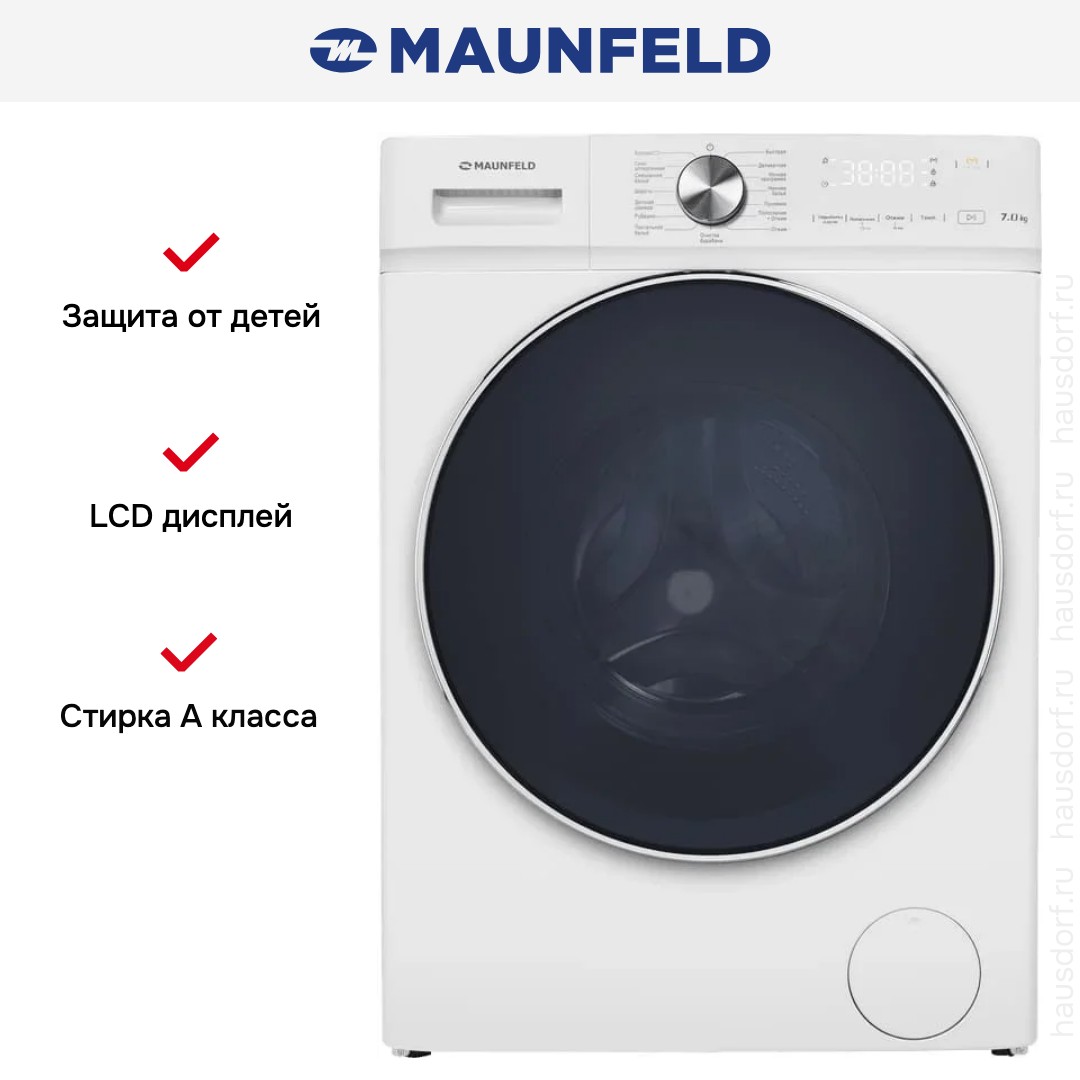 Стиральная машина Maunfeld MFWM127IWH053 — компактный и функциональный бытовой прибор для дома, выполненный в сдержанном белом корпусе с контрастным черным люком, который придает интерьеру аккуратный современный вид и облегчает загрузку благодаря диаметру дверцы 48 см и углу открытия 135°. Отдельностоящая фронтальная модель имеет габариты 85.3×59.5×50.5 см, глубину с открытой дверцей 96.5 см и подходит для стандартных ниш, при этом упаковочные параметры 90×66×52 см обеспечивают удобство доставки. Вместимость до 7 кг позволяет сочетать экономичность и вместительность: агрегат справится с повседневными партиями белья и объемными комплектами постельного белья или изделиями из пуха, предлагая 16 режимов для разных типов тканей — от хлопка и смешанных составов до деликатных материалов, шерсти, рубашек и тонкого белья. Набор экспресс-циклов включает быстрые и мини-программы для срочной очистки, а особые опции обеспечивают гигиеническую обработку при борьбе с аллергенами, функцию освежения и разглаживания паром, ночной режим для тихой работы, а также One Touch для доступа к дополнительным режимам с телефона. Панель управления объединяет интуитивный поворотный переключатель и сенсорные клавиши, цифровой дисплей информирует о ходе текущего цикла, времени до окончания и выбранных дополнительных функциях, а прямая компоновка элементов упрощает эксплуатацию; предусмотрена возможность выбора температуры и скорости отжима до 1200 об/мин, а также отсрочка старта от 1 до 24 часов с акустическим сигналом по завершении. Техническая часть оборудована инверторным мотором и нержавеющим барабаном, а стальной бак гарантирует долговечность; система автоматического взвешивания оптимизирует расход воды и электроэнергии, что подтверждается энергоэффективностью класса A+++ и потреблением 0.763 кВт·ч за цикл (около 168 кВт·ч в год), расходом 50 литров на цикл и годовой величиной примерно 11 000 литров. Уровни шума при стирке и отжиме составляют 62 и 76 дБ соответственно, а масса 52 кг (брутто 55.18 кг) делает установку устойчивой; для удобной регулировки предусмотрены ножки с выравниванием по высоте. Безопасность реализована комплексно: защита от перегрева и перепадов напряжения, блокировка при переливе, контроль пенообразования и дисбаланса, электронная система диагностирования неисправностей и детская защита панели снижает риск ошибок эксплуатации; загрузочный люк также имеет защитную блокировку. Для удобства дозирования предусмотрено три отделения для моющих средств, предусмотрена возможность стирки холодной водой и дополнительного полоскания. Электрические характеристики включают номинальную мощность 2 кВт, рабочее напряжение 220-240 В при 50 Гц и предохранитель 10 А. Благодаря сочетанию продуманного дизайна, широкого набора режимов и современных технологий машина станет практичным решением для семей, ценящих экономию ресурсов, бережное обращение с вещами и комфорт управления, сохраняя при этом стильный внешний вид и надежность в повседневной эксплуатации.