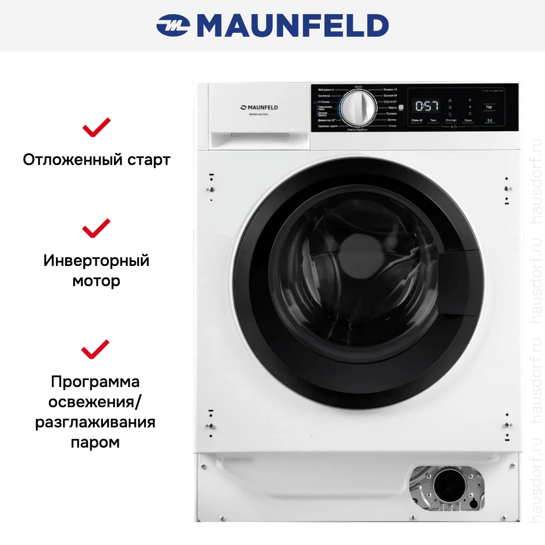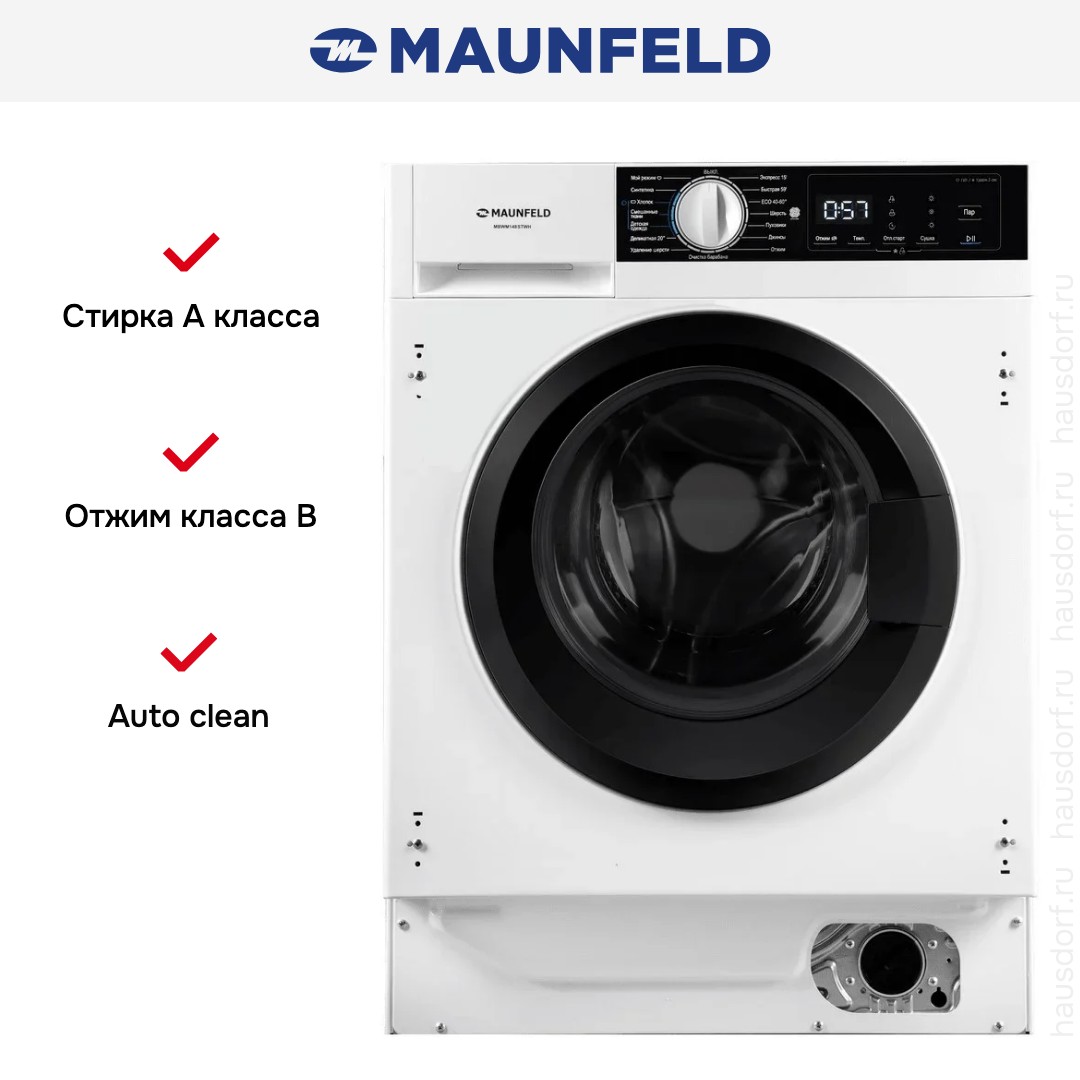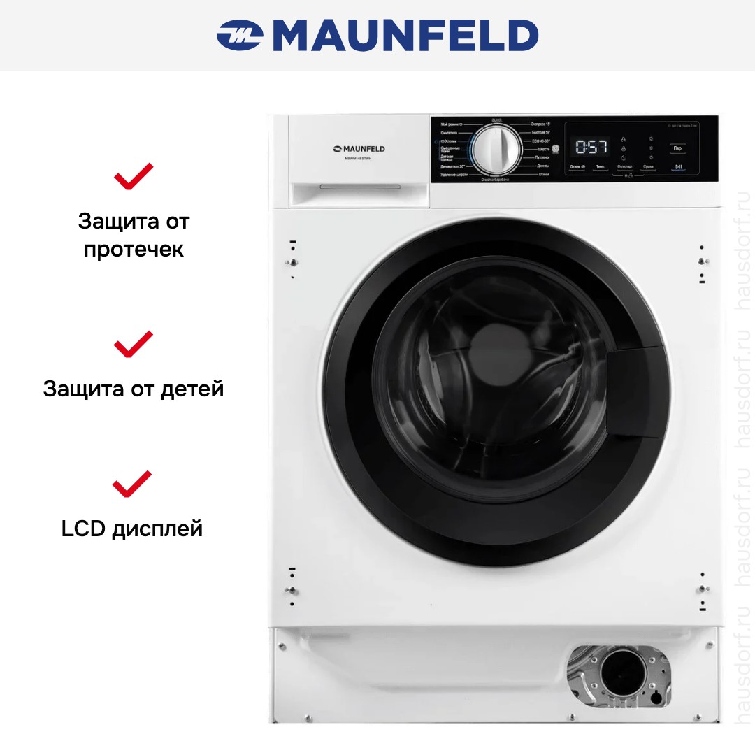 Стиральная машина Маунфилд MBWM148STWH принадлежит к немногочисленному сегменту встраиваемой техники — для ее установки необходимо тщательно выбрать заранее нишу в мебельном гарнитуре. Благодаря классической фронтальной загрузке она привычна и удобна даже для тех, кто не очень разбирается в технике. За счет небольшой глубины данную модель предпочитают владельцы небольших квартир, студий. Вместительность барабана средняя, поэтому ее хватит и для одиночек, и для семей с детьми. Максимальная загрузка: 8 кг.