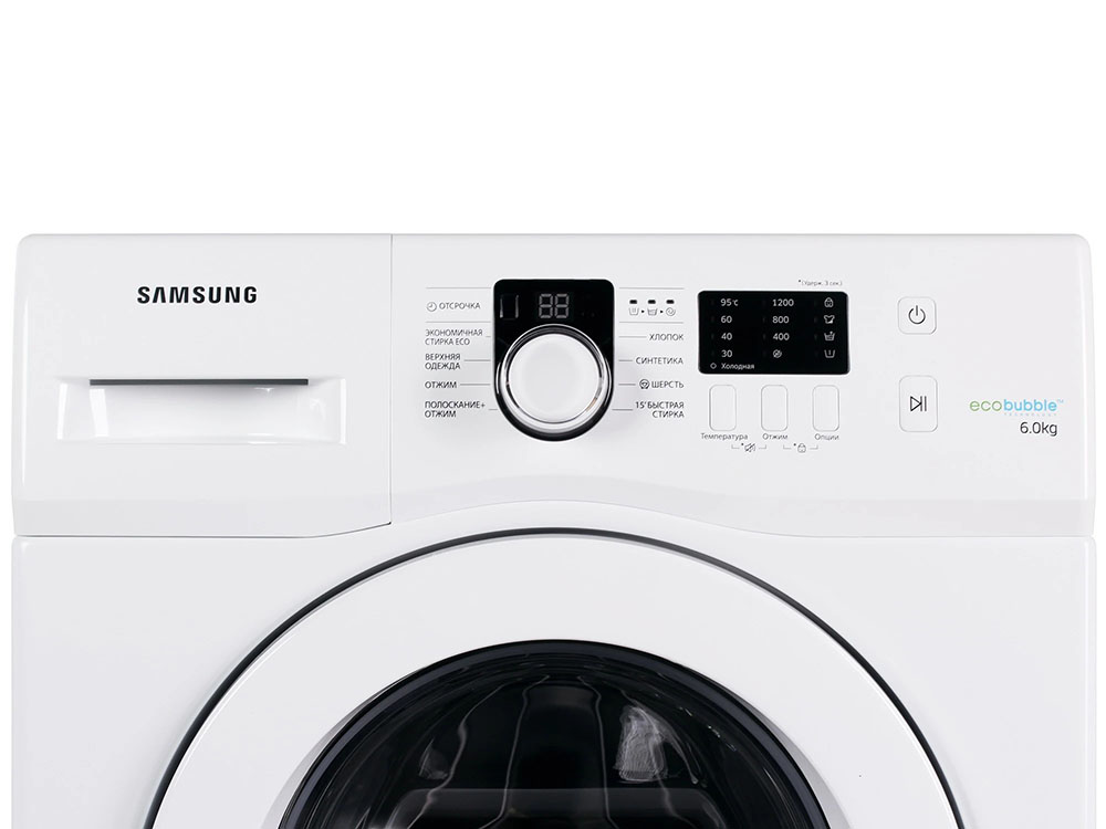 Стиральная машина Самсунг WF 60 F1R0E2W/DLP выпущена в стандартной конфигурации — устанавливается отдельно, поэтому рекомендуем заранее выделить для нее место в квартире. Благодаря классической фронтальной загрузке она привычна и удобна даже для тех, кто не очень разбирается в технике. За счет небольшой глубины данную модель предпочитают владельцы небольших квартир, студий. В барабан помещается не так много вещей за один раз, но тем, кто не любит копить вещи или просто мало стирает, будет достаточно. Максимальная загрузка: 6 кг.