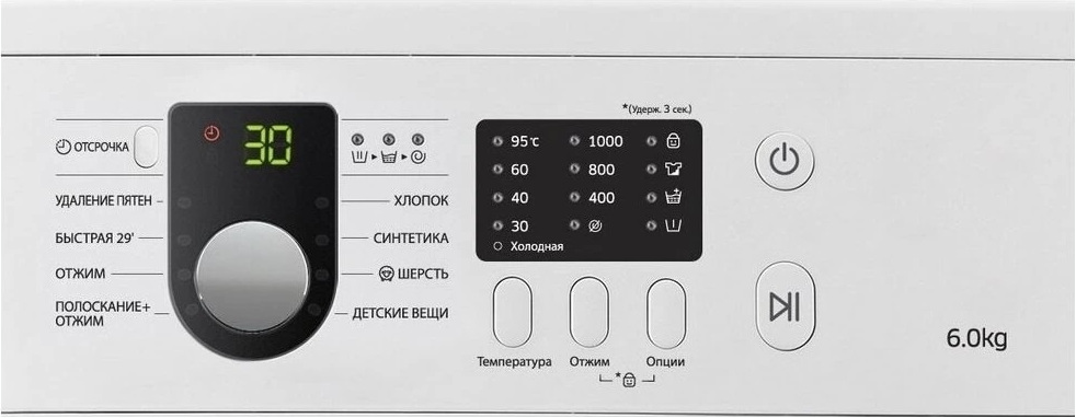 Достаточно простыми, но гораздо более информативными являются цифровые дисплеи, которые могут отображать числовую информацию и ограниченное количество символов. На таком дисплее, например, может отобразиться номер программы, скорость отжима, блокировка люка, отсрочка старта, температура воды, время, оставшееся до конца работы, символические обозначения действующих функций и прочая достаточно простая информация. Изображение может быть разного цвета — белого, зеленого или голубого, в любом оно будет хорошо заметно даже при отключенном освещении.
