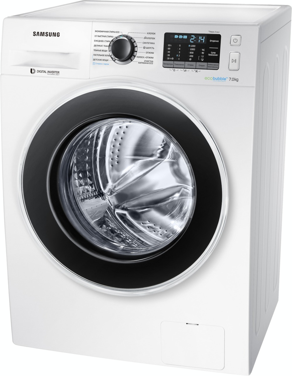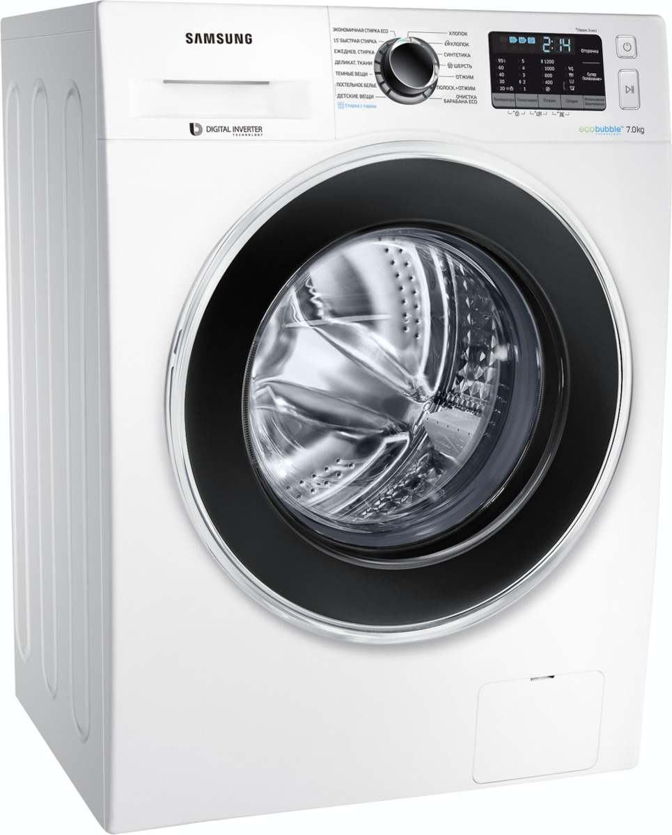 Цвет этой стиральной машинки — белый. В данной модели Samsung используется барабан Diamond. Мотор: Инверторный. Благодаря ему машина работает тише, потребляет меньше электроэнергии, сохраняя при этом необходимую мощность.