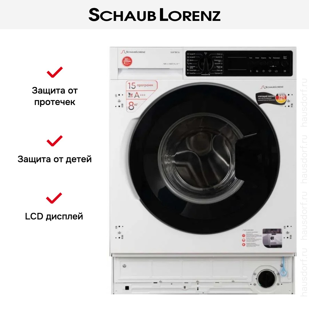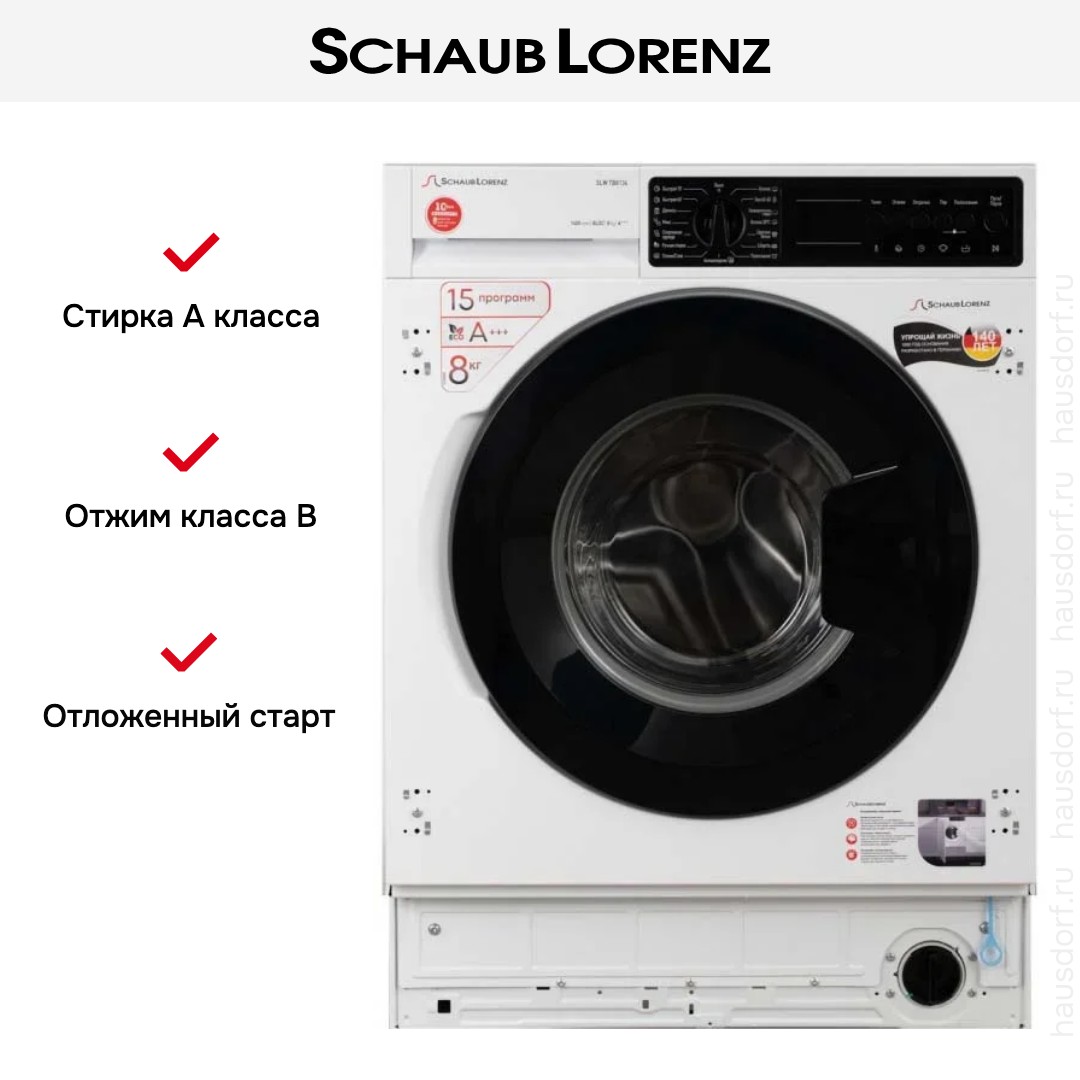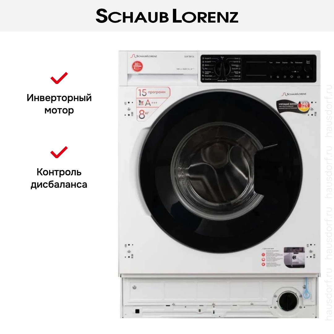 Стиральная машина Schaub Lorenz SLW-TB8134 — встроенная фронтальная модель для дома с элегантным белым фасадом и аккуратными габаритами, разработанная для тех, кто ценит скрытую интеграцию и продуманную эргономику.