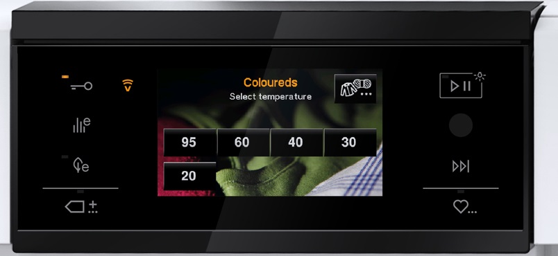 Ряд производителей защищает панель управления акриловым стеклом — синтетически материалом высокой прочности и прозрачности, устойчивым к воздействию влаги и бактерий. Другой выход из этого положения поворотная панель управления — например, в машинах известной швейцарской марки V-Zug. Она легко выдвигается вверх, когда необходимо ввести программу или получить какую-либо информацию. Максимальный угол отклонения от вертикали при этом может составлять 45°. Когда программа выбрана и нажата кнопка Пуск, панель можно вернуть обратно в вертикальное положение.