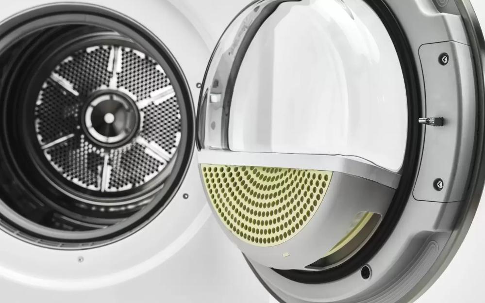 - Тепловой насос — поступающий внутрь воздух нагревается, что ускоряет и улучшает эффективность сушки. Затем он проходит через конденсационный отдел, отдает влагу и сухим повторно возвращается в барабан.
