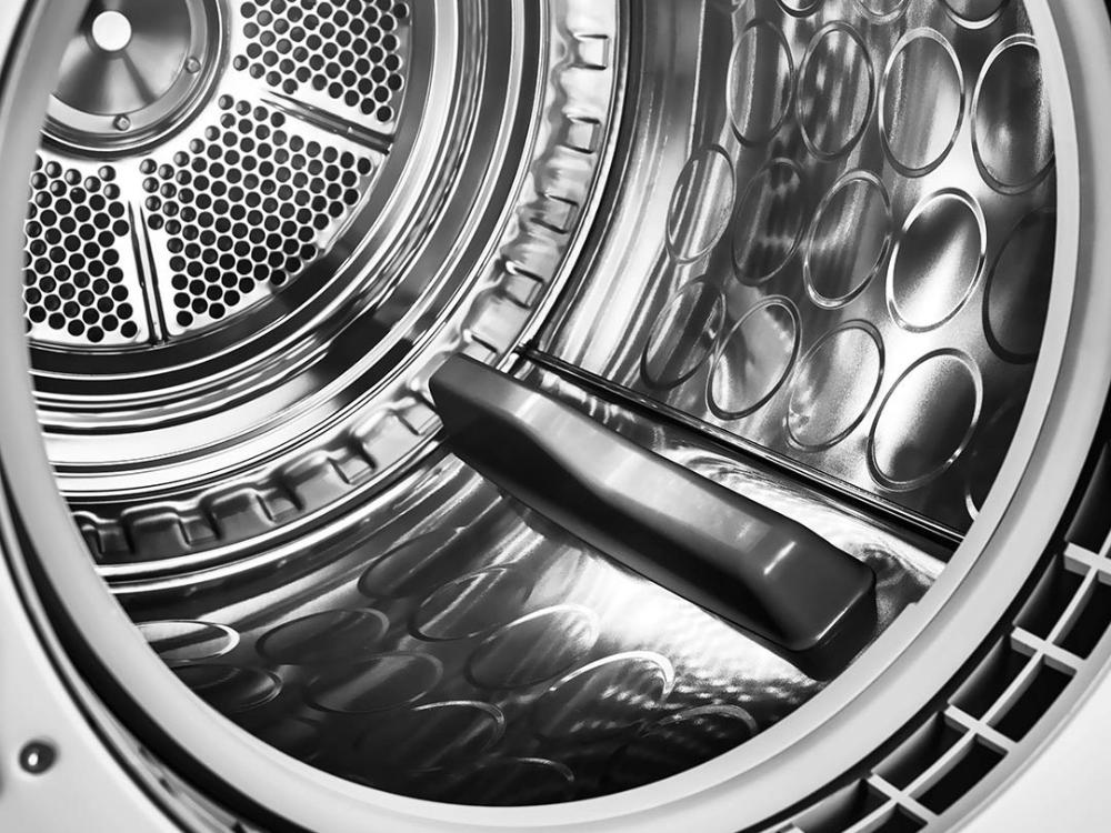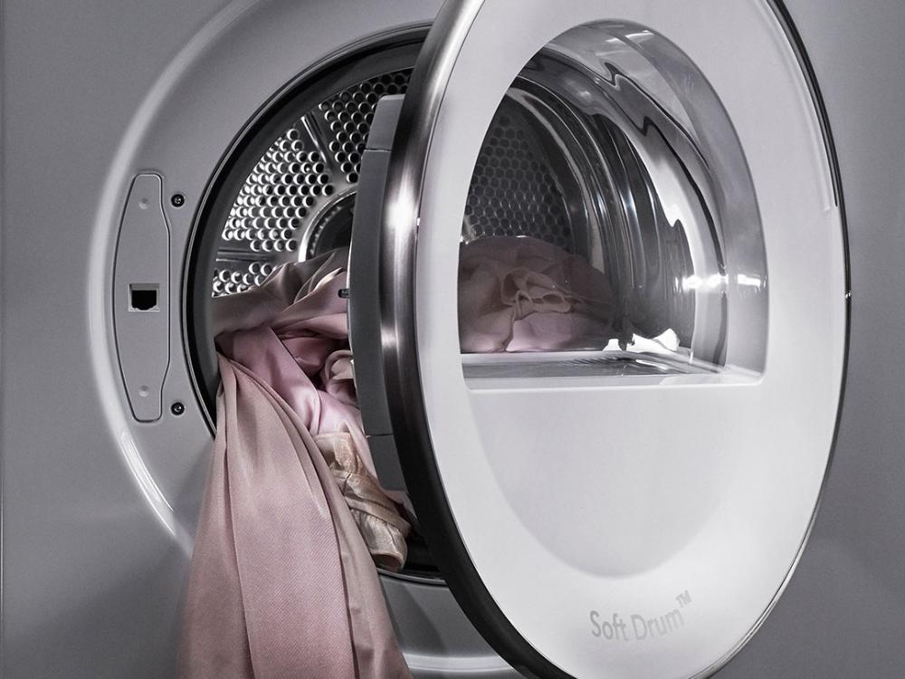 Внутреннее устройство ориентировано на деликатный уход: объём барабана 117 л и максимальная загрузка 9 кг дают простор для крупных изделий, а материал бака и барабана — нержавеющая сталь — обеспечивает долговечность и гигиеничность. Барабан Soft Drum работает щадяще, лопасти Butterfly™ равномерно распределяют влажность, подсветка облегчает укладку вещей, а система сенсорного измерения влажности Sensidry автоматически определяет степень готовности белья. Среди опций — режимы для шёлка и шерсти, мужских сорочек, спортивного белья, джинсов, пуховых изделий и махровых тканей, а также экспресс-процедуры и функция проветривания.