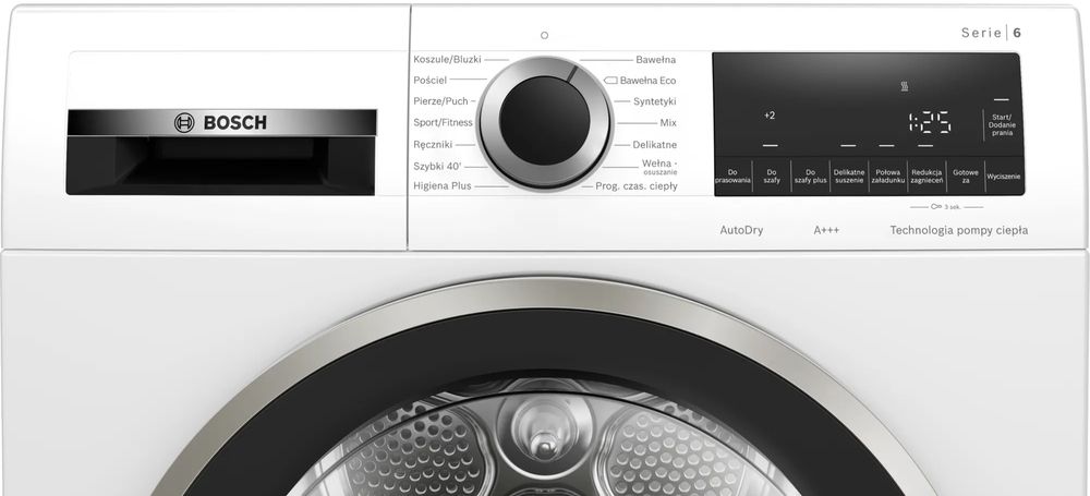 Дисплей на сенсорной или кнопочной панели управления сушильной машины позволяет оперативно отслеживать ход работы, а также регулировать параметры сушки. Самые простые отдельно стоящие модели с электронной системой управления оснащаются цифровым дисплеем, на котором отображается выбранная программа сушки, время, оставшееся до окончания цикла и дополнительные опции — например, отсрочка старта. Устройства более высокого уровня могут оснащаться текстовыми FSTN-дисплеями большого размера или полноцветными графическими дисплеями, позволяющими выбирать программы и опции при помощи меню.