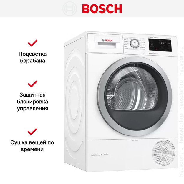Самоочистка конденсатора — полезная функция, присутствующая в сушильных машинах от ведущих производителей бытовой техники, например, Bosch и Siemens, и облегчающая уход за прибором. Конденсатором оснащаются устройства с конденсационной сушкой или сушкой с тепловым насосом . Для очистки требуется только выбрать соответствующую программу и запустить ее: ворсинки и прочий мусор будут удалены автоматически. В некоторых случаях очистка производится без участия человека после каждого рабочего цикла: чтобы промыть конденсатор, используется влага, полученная в процессе сушки.
