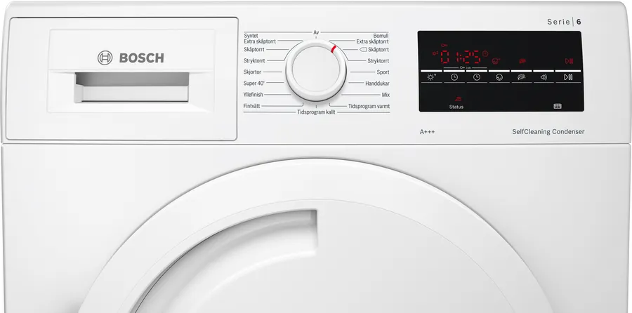 Самоочистка конденсатора — полезная функция, присутствующая в сушильных машинах от ведущих производителей бытовой техники, например, Bosch и Siemens, и облегчающая уход за прибором. Конденсатором оснащаются устройства с конденсационной сушкой или сушкой с тепловым насосом . Для очистки требуется только выбрать соответствующую программу и запустить ее: ворсинки и прочий мусор будут удалены автоматически. В некоторых случаях очистка производится без участия человека после каждого рабочего цикла: чтобы промыть конденсатор, используется влага, полученная в процессе сушки.