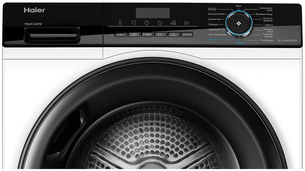 Тип сушки белья в данной модели — тепловой насос. Благодаря этому воздух поступает в барабан уже теплым, что ускоряет работу.