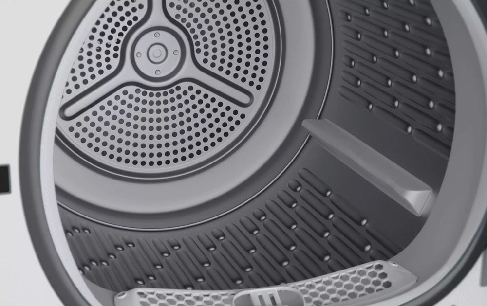 Стенки барабана покрыты «сотами» — небольшими выемками, благодаря которым образуется воздушная прослойка. Она амортизирует белье, увеличивает скорость сушки, предохраняет от складок.