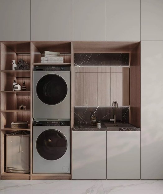 Ширину сушильной машины следует учитывать при любом варианте установки. Стандартное значение этого показателя составляет 59-60 см: такие устройства подходят для установки в колонну со стиральными или бок-о-бок с ними, а также для встраивания под столешницу или в кухонную тумбу. Они являются наиболее востребованными благодаря достаточно большому весу загрузки. Наименьшая ширина сушилок составляет 55-56 см, а максимальное значение этого параметра достигает 70 см. Самой большой шириной отличаются модели для профессионального использования, рассчитанные на увеличенный вес загрузки.
