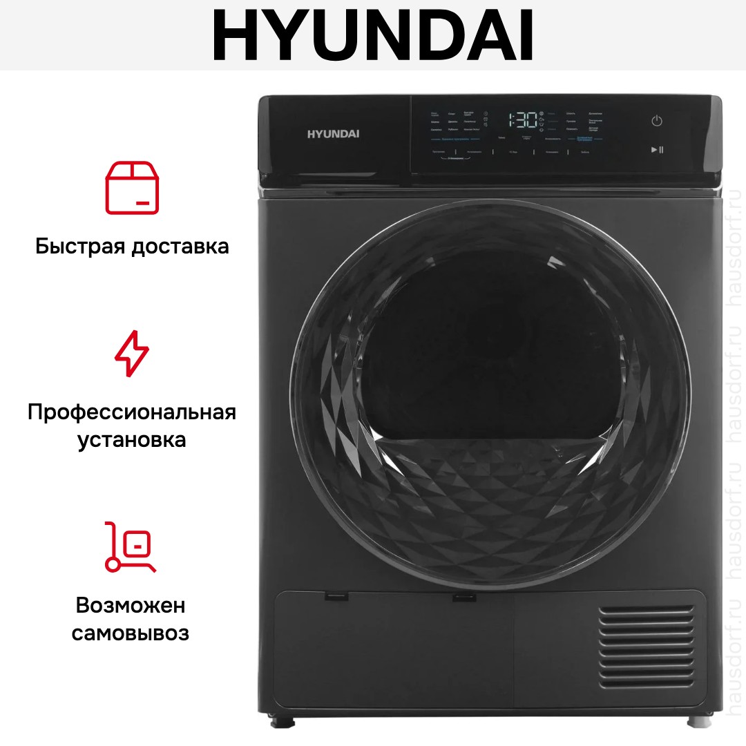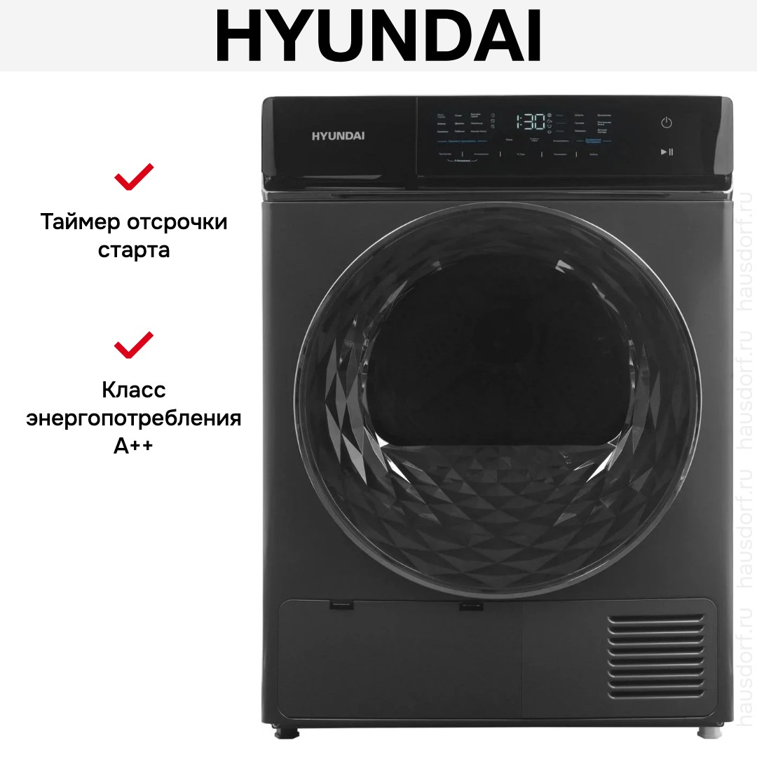 Сушильная машина Hyundai DFE8401 — отдельностоящий бытовой прибор для дома в элегантном сером корпусе с черной дверцей люка, сочетая сдержанный стиль и практичность. Ее габариты 84.5×59.8×65.2 см позволяют легко разместить агрегат в подсобном помещении, на кухне или в отдельной прачечной, а чистая масса 48 кг обеспечивает устойчивость при работе. Правый навес дверцы и угол открытия 150° упрощают загрузку и выгрузку, диаметр люка 320 мм комфортен для крупногабаритных вещей.
