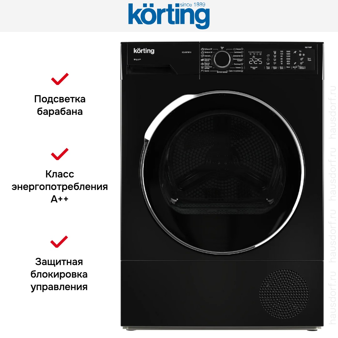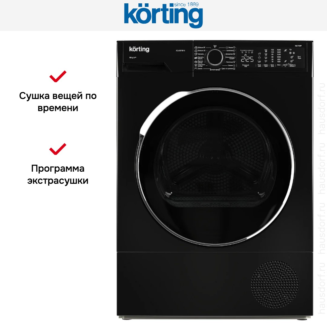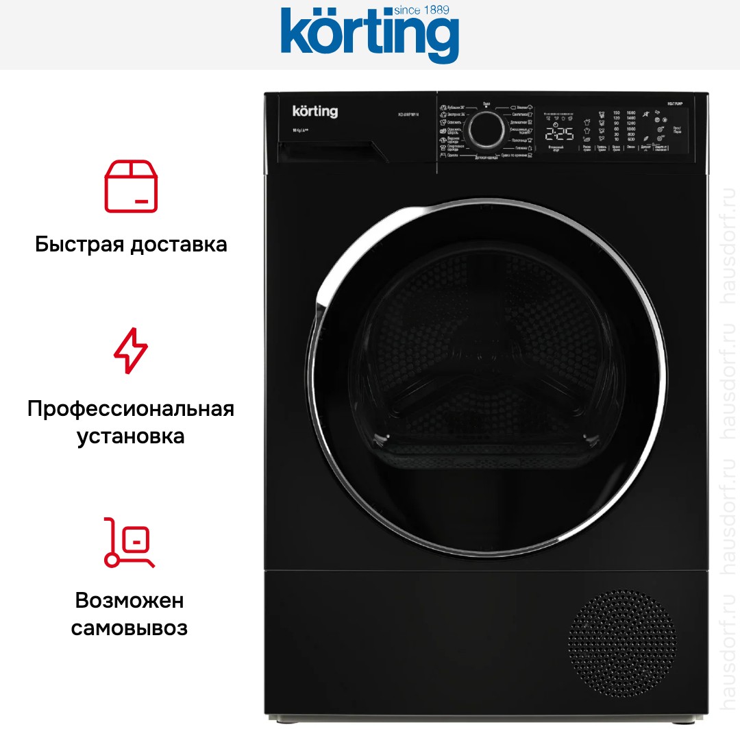 Сушильная машина Korting KD 60HP109-N создана для домашнего использования и предлагает универсальные варианты установки: отдельно стоящая, в колонну или под столешницу. Ее строгий чёрный корпус и тёмная панель управления выглядят современно и впишутся в любой интерьер. Большой люк того же цвета облегчает загрузку, а диаметр 330 мм и угол открытия 135° сокращают неудобства при размещении громоздких вещей.
