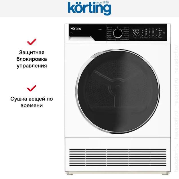 Korting KD 60L97 — отдельно стоящая сушильная машина для дома в корпусе белого цвета, с большим черным люком и черной панелью управления. Ее особенность — эффектная подсветка барабана во время работы. Сушилка может быть размещена бок о бок со стиральной машиной Кертинг или для экономии места может устанавливаться на нее сверху: закрепить ее поможет специальный соединитель. Максимальный вес загрузки составляет 10 кг влажного белья: модель подойдет для использования в большой семье или для регулярного ухода за детской одеждой. Специалисты рекомендуют не загружать машину максимально, чтобы белье просушивалось более равномерно. Люк открывается на угол до 135 градусов, так что объемные вещи помещаются в барабан без усилий.