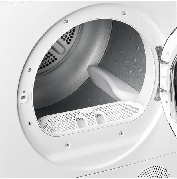 - Тепловой насос — поступающий внутрь воздух нагревается, что ускоряет и улучшает эффективность сушки. Затем он проходит через конденсационный отдел, отдает влагу и сухим повторно возвращается в барабан.