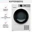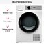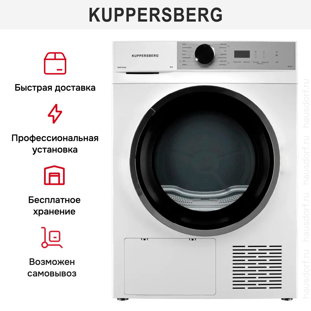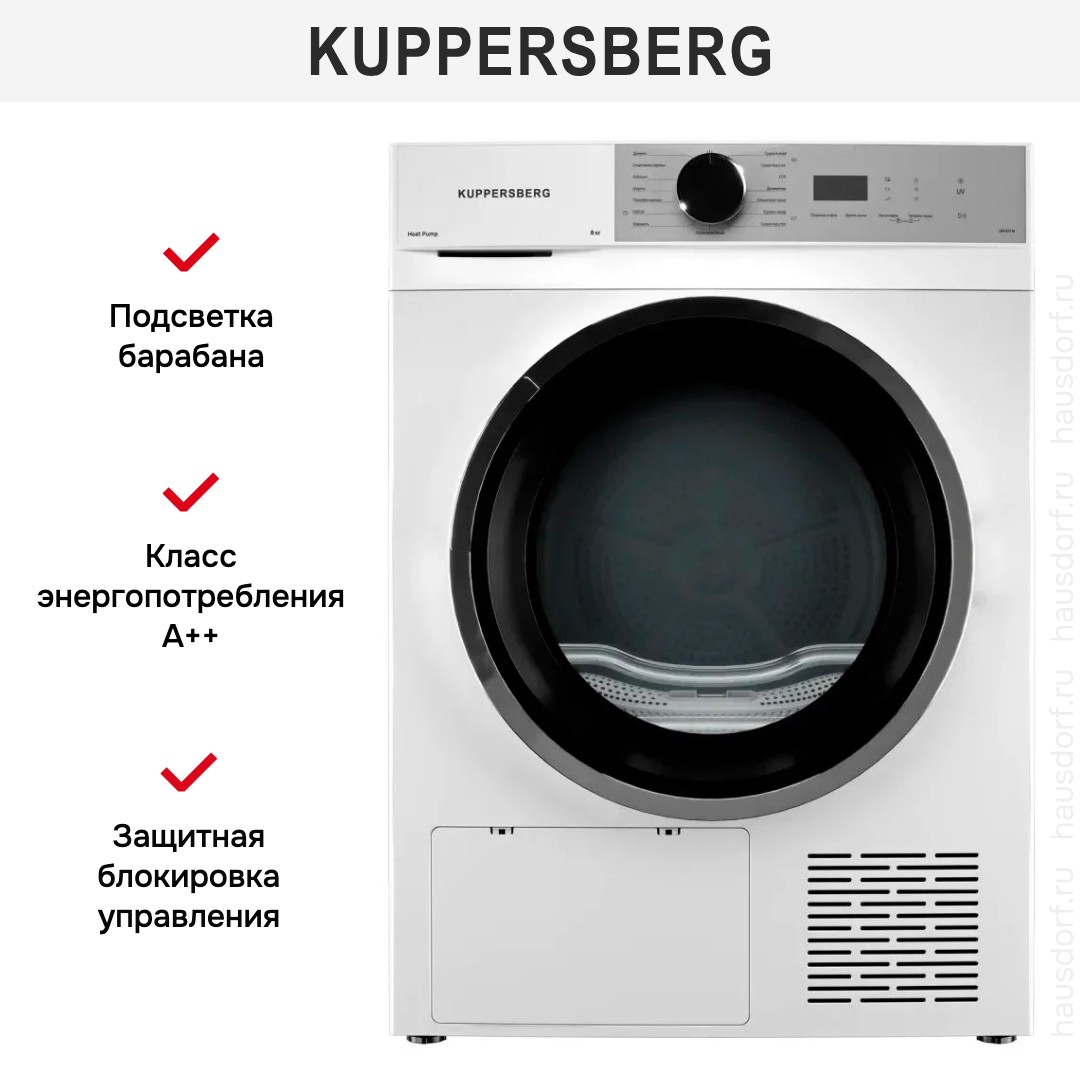 Сушильная машина Kuppersberg DM 611 W — элегантный и функциональный прибор для дома, объединяющий продуманный внешний вид и современные технологии. Белый корпус сочетается с контрастной чёрной дверцей люка с крупным круглым стеклом, диаметр загрузочного проёма составляет 510 мм, что облегчает укладку крупной постели и объёмных вещей. Навес двери расположен справа, конструкция предусматривает удобство загрузки и чистки, а горизонтальная панель управления с цифровым дисплеем и комбинированными органами (поворотный программатор плюс сенсорные клавиши Touch Control) делает выбор режимов интуитивным; есть клавиша отключения звуковых сигналов для работы без оповещений.