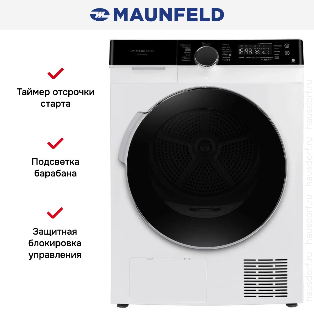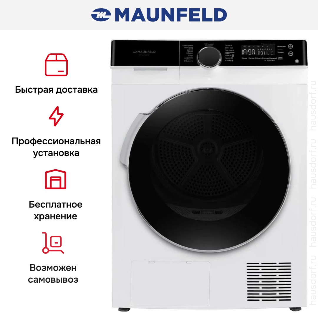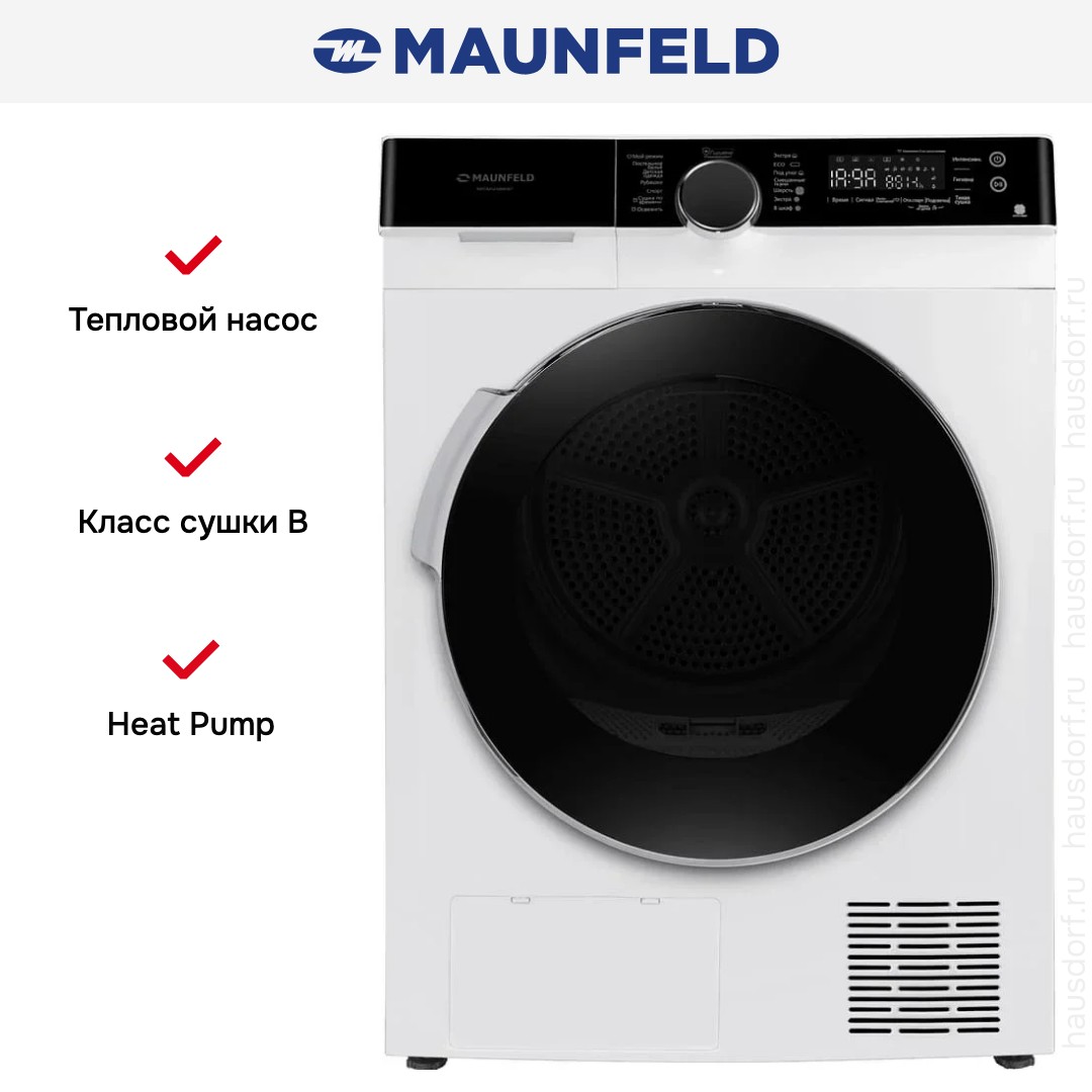 Maunfeld MFDM1410WH07 — стильный и продуманный прибор для дома, созданный с акцентом на экономичность и удобство использования; его лаконичный корпус в белом цвете с черной панелью управления и стеклянной дверцей придает интерьеру аккуратный и современный вид, а прочные регулируемые ножки обеспечивают ровную установку на любой поверхности. Конструкция наклонной панели с поворотным программатором и сенсорными клавишами делает взаимодействие интуитивно понятным: LED-дисплей отображает этап работы, оставшееся время и отложенный старт, а также указывает на необходимость опорожнения емкости для конденсата и очистки ворсового фильтра, упрощая уход. Внутренний барабан из нержавеющей стали оснащен подсветкой, что облегчает загрузку и контроль за вещами, диаметр люка 375 мм и угол открывания 160° гарантируют удобный доступ при загрузке белья весом до 10 кг, а навес двери справа учитывает эргономику размещения в бытовом помещении. Тепловой насос с компрессором и хладагентом R290 обеспечивает эффективное высушивание при минимальном потреблении энергии: класс энергопотребления A+++, среднегодовое потребление — 211 кВт·ч, что заметно снижает эксплуатационные расходы по сравнению с традиционными решениями; класс сушки B и опция экстрасушки позволяют подобрать режим под фактическую влажность, включая режимы «под утюг» и «в шкаф». Набор программ впечатляет: 14 предустановок охватывают хлопок и лен, синтетику, деликатные ткани, спортивное белье, смешанные загрузки, шерсть и мужские сорочки, есть опции для постельного белья, сушки по времени и специальная «ЭкоДетская одежда» для заботы о вещах малышей. Функционал дополнен обработкой паром для освежения, режимом легкого глажения/антисминания и возможностью выбора степени или длительности просушки; кнопки позволяют выставить отсрочку старта от 1 до 12 часов, включать и отключать звуковой сигнал по завершении, а также блокировать панель для защиты от детей. Инверторный двигатель обеспечивает плавную и тихую работу при уровне шума в 65 дБ, при этом прибор снабжен встроенной сервисной диагностикой, индикаторами состояния и возможностью сохранения пользовательских настроек (MyFavourite). В комплекте идут ворсовый фильтр, дренажный шланг для слива конденсата, соединитель и держатель шланга — это позволяет организовать постоянный отвод влаги без лишних усилий; предусмотрена емкость для конденсата для тех случаев, когда подключение к канализации затруднено. Габариты устройства 85×59.5×68.3 см, в упаковке 89×64×74 см, глубина с открытой дверцей достигает 114.5 см, масса нетто 49 кг, брутто 52 кг; прибор рассчитан на стандартное питание 220-240 В при частоте 50 Гц и максимальной потребляемой мощности 0.75 кВт, предохранитель 3.5 А. Этот аппарат сочетает в себе продуманный дизайн, щадящую по отношению к тканям технологию и набор опций, позволяющий гибко настраивать процессы в соответствии с типом загруженных вещей, создавая удобный и экономичный режим ухода за гардеробом в домашних условиях; сушильная машина от Maunfeld станет надежным решением для тех, кто ценит качество, функциональность и бережное отношение к вещам.