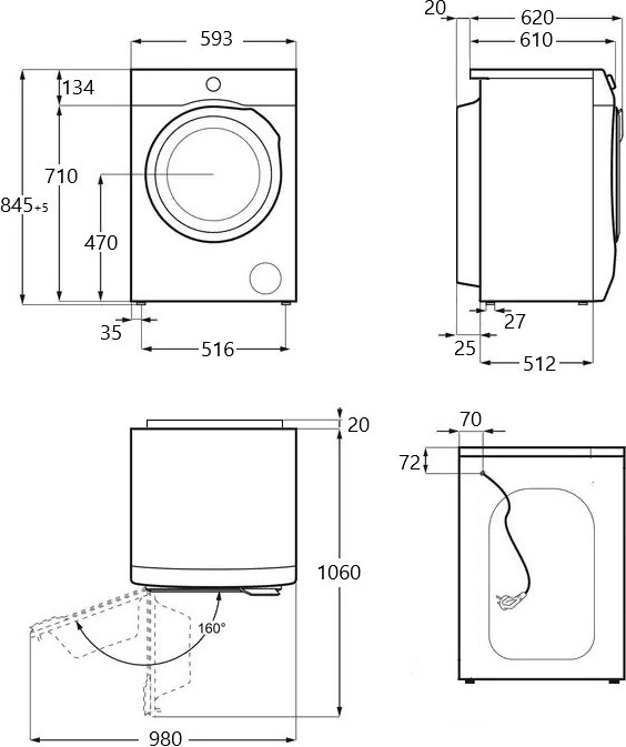 Высота сушильной машины составляет 82-85 см, благодаря чему ее можно разместить под столешницей — например, в ванной рядом с раковиной. У некоторых моделей высоту прибора можно уменьшить, сняв верхнюю крышку и заменив специальной технологической крышкой для встраивания или металлической плитой.
