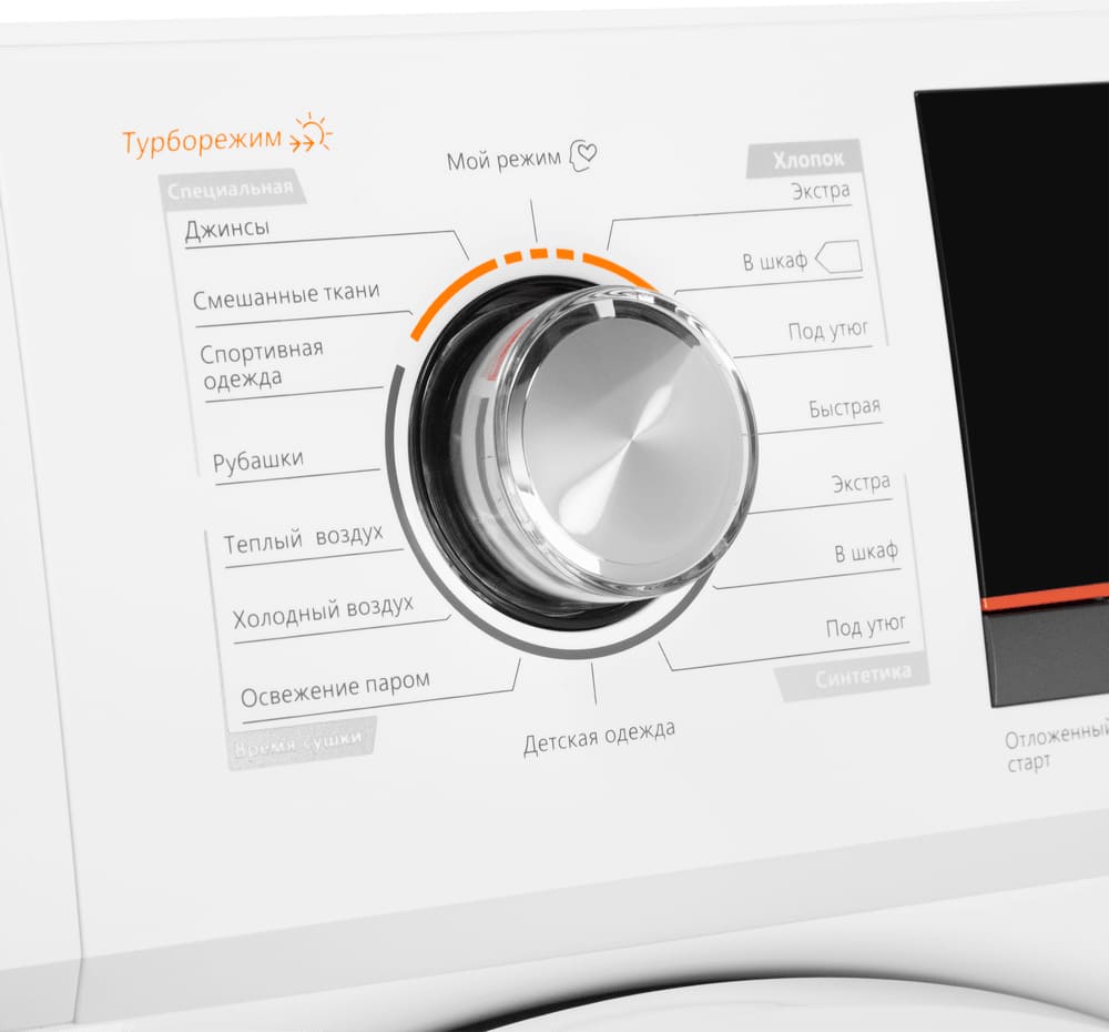 Элементы на панели управления сушильной машины служат для выбора программы сушки, для регулировки параметров работы, для задания дополнительных опций. Большинство сушильных маши оборудовано поворотными переключателями: с их помощью можно легко выбирать программу сушки — по остаточной влажности, по типу ткани, по виду изделий, по времени. Кнопки предназначаются для добавления к программе дополнительных опций: они могут быть как обычными, так сенсорными — в последнем случае все варианты выбора отображаются на дисплее, и возможности управления становятся более удобными и гибкими.