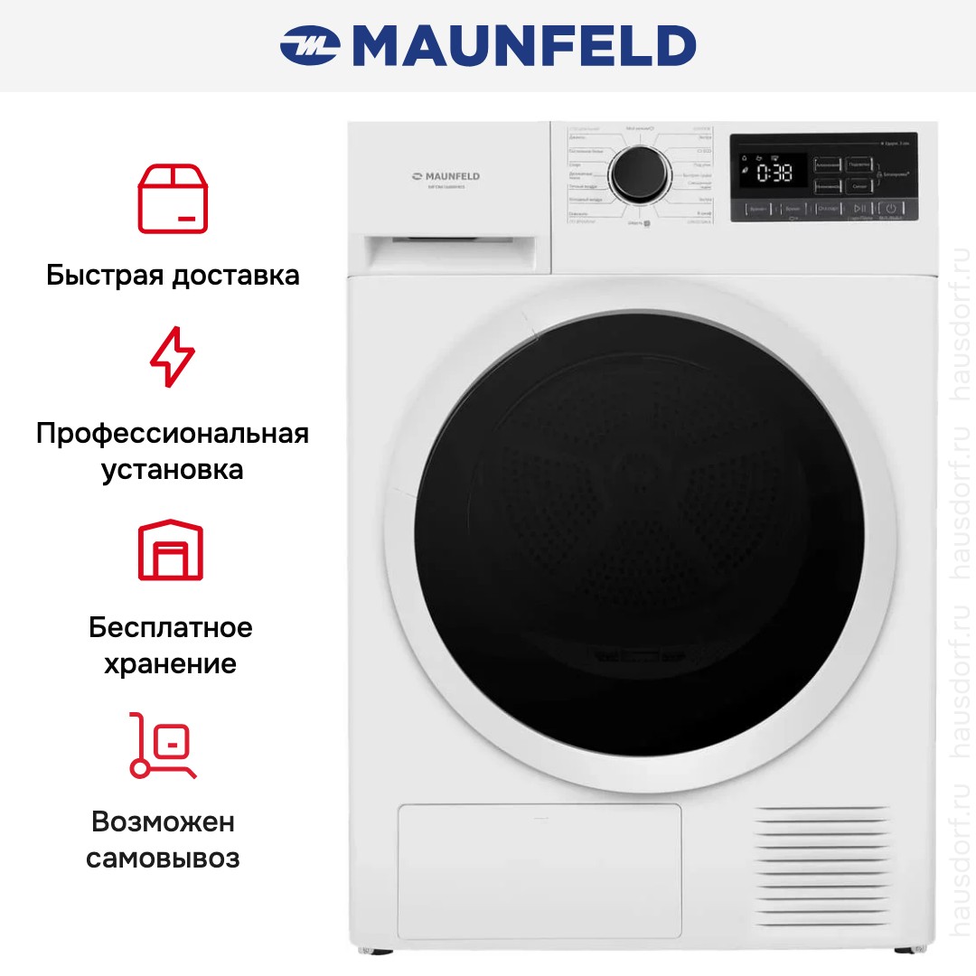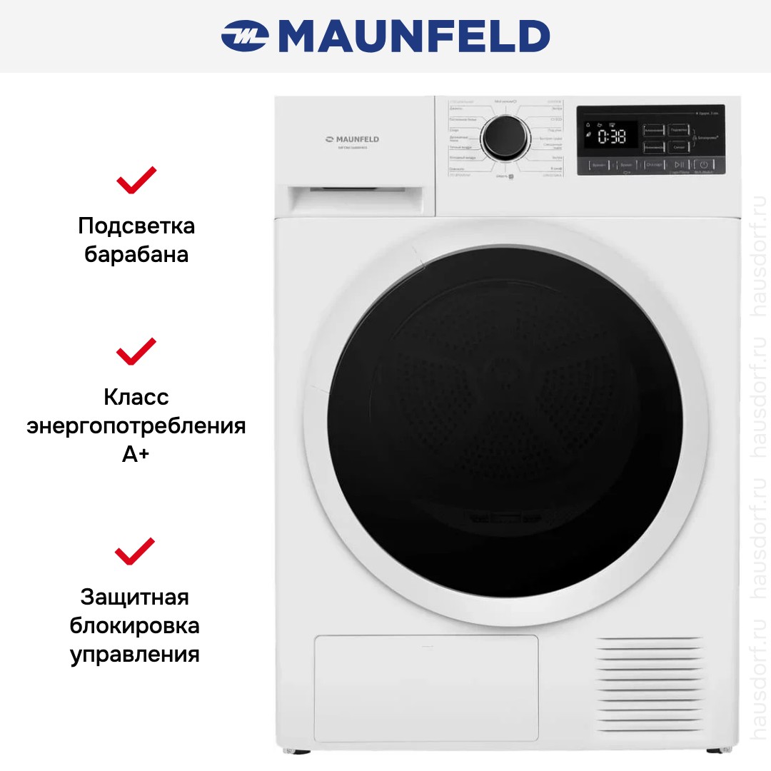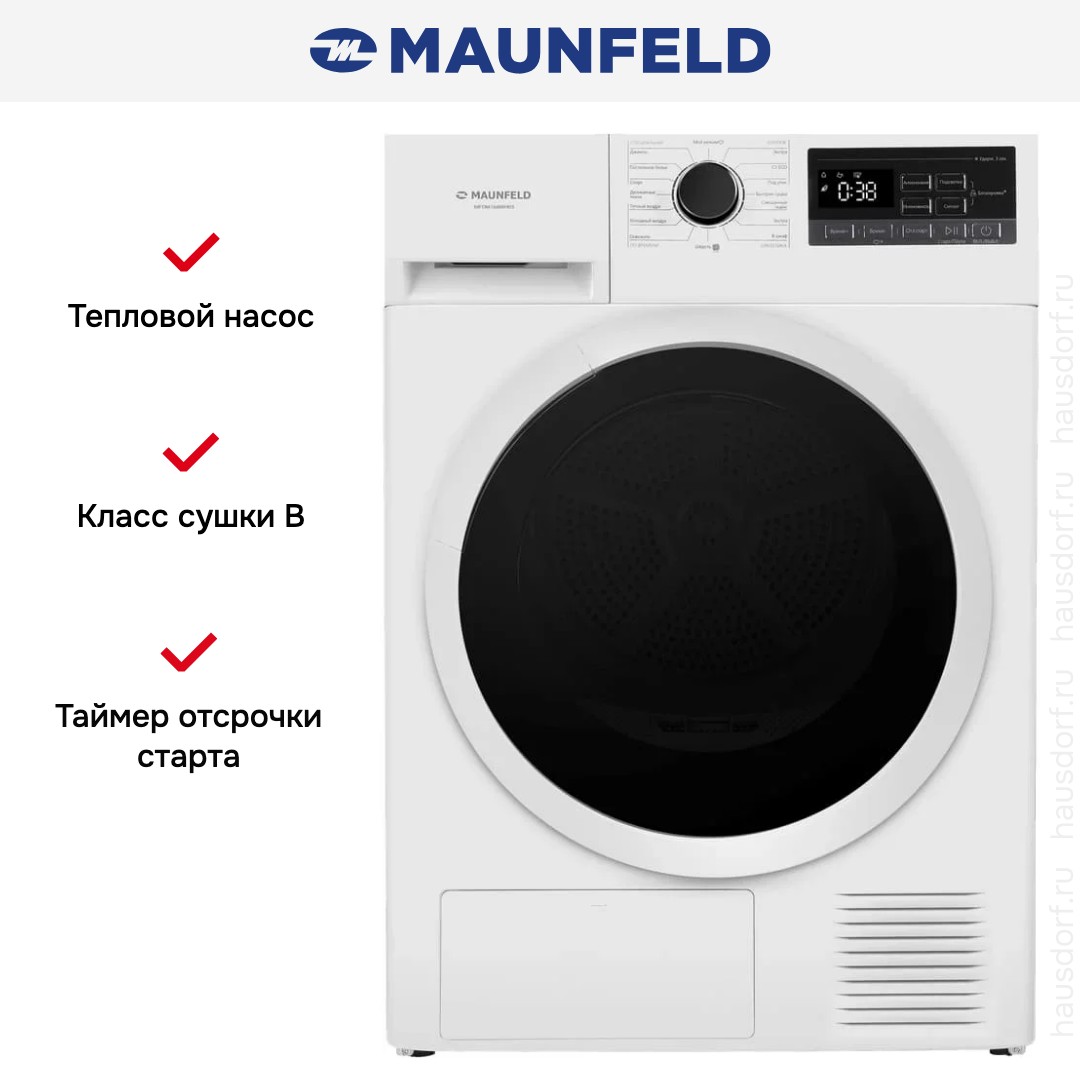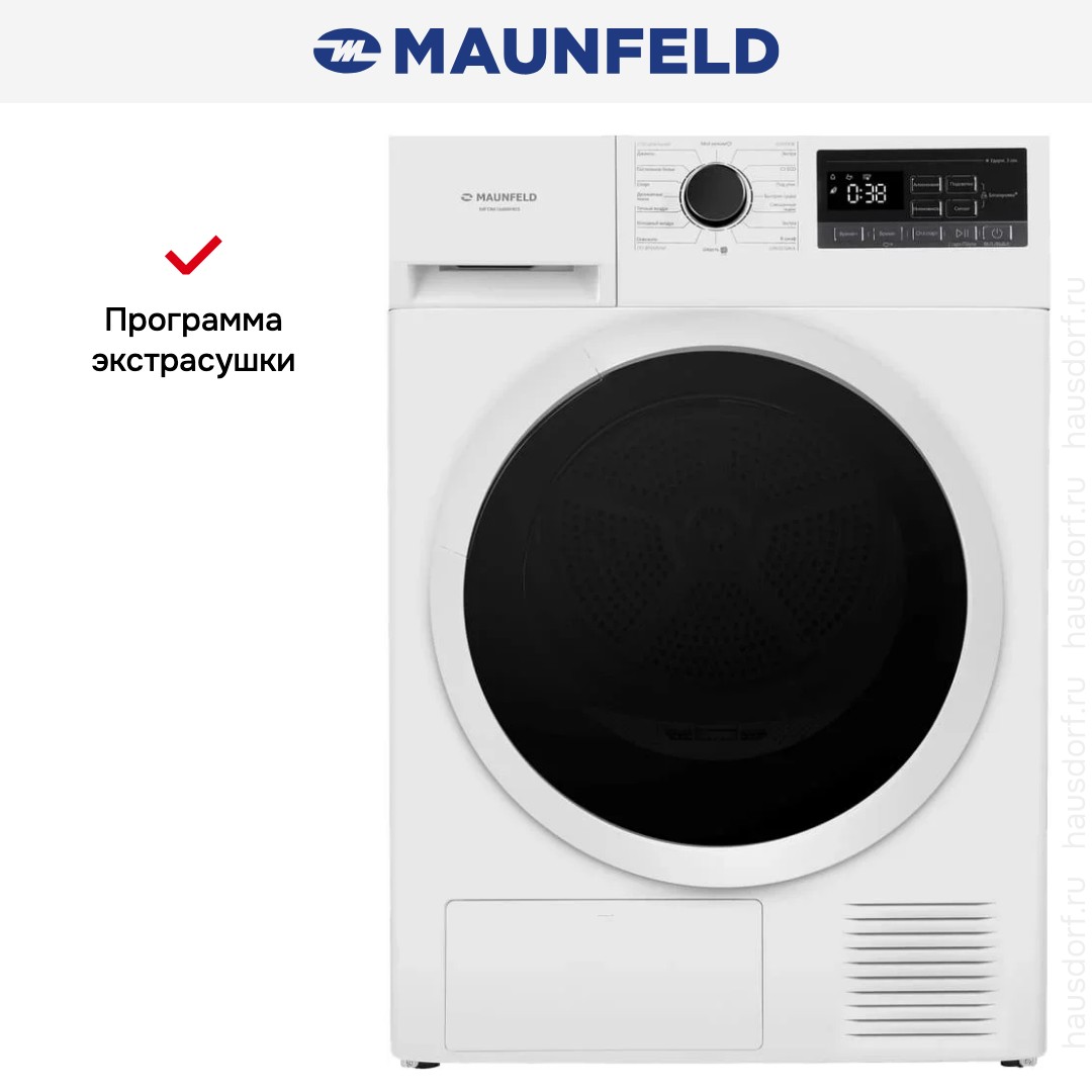 Сушильная машина Maunfeld MFDM168WH03 представляет собой стильный и продуманный бытовой прибор, созданный для комфортной эксплуатации в жилых условиях. Белый корпус гармонично сочетается с чёрной панелью управления и стеклянной дверцей, образуя современный контрастный образ, который легко впишется в интерьер любой прачечной зоны. Круглая люк-формула с закалённым стеклом открывается на 160° вправо, обеспечивая удобный доступ к нержавеющему барабану, внутри которого размещена подсветка для простоты загрузки. Барабан из стойкой стали гарантирует деликатный подход к тканям, а вместимость до 8 кг позволяет одновременно обрабатывать как повседневные вещи, так и большую партию постельного комплекта. Тепловой насос экономно расходует электроэнергию, что подтверждается классом A+ и среднегодовым потреблением около 291 кВт·ч; при этом эффективность сушки соответствует классу B, а уровень шума на рабочем цикле составляет 66 дБ, что делает работу малозаметной в жилом помещении. Набор программ включает шестнадцать вариантов, среди которых режимы для хлопка и синтетики, деликатное и шерстяное, быстрая экспресс-сушка, специальные опции для спортивного белья, джинсов и смешанных загрузок, а также отдельная программа для постельного белья — всё это позволяет подобрать оптимальные параметры для каждого типа ткани. Наличие паровой обработки используется для освежения вещей, а регулировка степени сушки по остаточной влажности позволяет выбрать «под утюг», «в шкаф» или «экстрасушка» в зависимости от дальнейших потребностей. Интеллектуальная система с сенсором влажности автоматически отслеживает состояние белья и завершает цикл в нужный момент, экономя ресурсы и продлевая срок службы изделий. Панель управления сочетает поворотный программный регулятор и кнопки, а LED-дисплей информирует о времени до окончания, необходимости опорожнить ёмкость для конденсата или очистить ворсовый фильтр, а также сигнализирует о блокировке от детей и любых неполадках; для удобства пользователя предусмотрены функции отсрочки старта от 1 до 24 часов, звуковой сигнал по окончании, сохранение персональных настроек (MyFavourite) и возможность выбора дополнительных опций вроде тёплого или холодного обдува и антиусадочной обработки. Для отвода конденсата предусмотрены как резервуар, так и комплект для постоянного слива: дренажный шланг, соединитель и держатель упрощают монтаж. Практичная конструкция включает регулируемые ножки, правую навеску дверцы и компактные габариты 84.5×59.5×61 см, а в упаковке прибор занимает 89×66×71 см; при открытой дверце глубина достигает 105 см, вес нетто составляет 42 кг, брутто — 45.48 кг. Техническая часть предполагает работу от сети 220-240 В и 50 Гц с предохранителем 3,5 А и потребляемой мощностью 0,8 кВт; хладагент R290 обеспечивает эффективный цикл, а встроенная сервисная диагностика упрощает обслуживание. Набор элементов поставки включает ворсовый фильтр и все необходимые крепёжные детали, а удобный дизайн, понятное управление и широкий функционал делают этот прибор удачным решением для тех, кто ценит бережную обработку одежды и энергоэффективность; отдельно стоит отметить внимание к безопасности: блокировка панели исключит случайное вмешательство, а продуманные режимы уменьшат потребность в дополнительной обработке и глажке. Кроме эстетики 