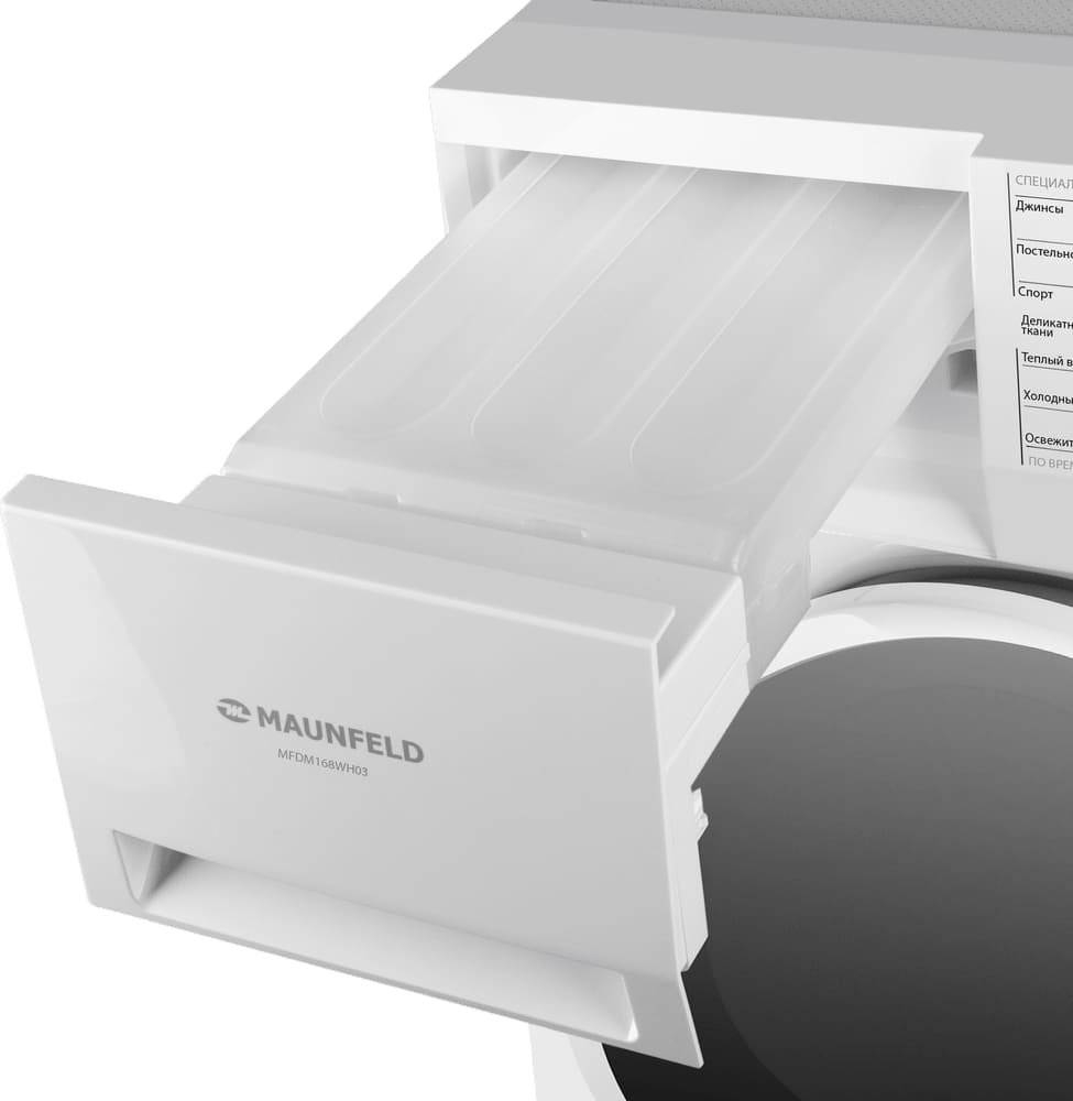 Сушильная машина Maunfeld предназначена для домашнего использования, поэтому имеет стандартные габариты и большое разнообразие программ. Так как она устанавливается отдельно, нужно заранее найти достаточно места в помещении.