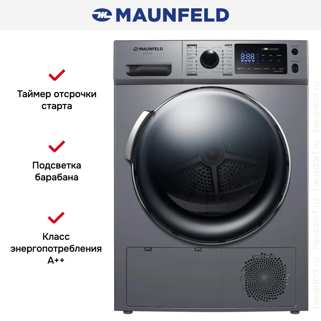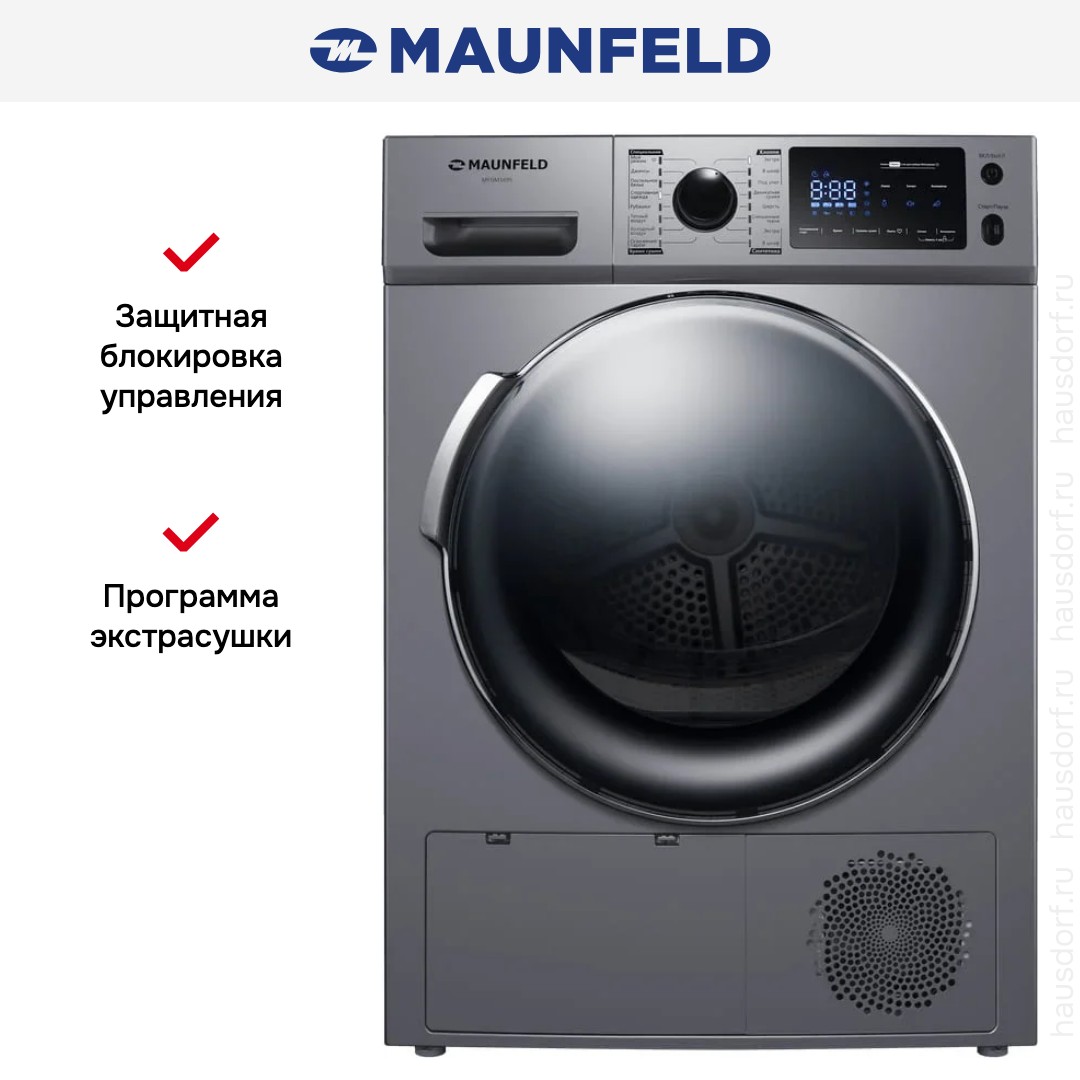 Сушильная машина Maunfeld MFDM169S представляет собой продуманный бытовой прибор, в котором эстетика сочетается с функциональностью: лаконичный серебристый корпус с черной панелью управления и дверцей легко впишется в современную кухню или прачечную, а округлая стеклянная фронтальная дверца диаметром 375 мм при угле открывания 160° обеспечивает удобный доступ к барабану из нержавеющей стали с подсветкой и сотовой структурой, бережно обращающейся с тканями. Эта отдельностоящая модель допускает вертикальную установку в колонну, оснащена регулируемыми ножками и правым навесом люка, что дает свободу планирования пространства. Тепловой насос с компрессором Heat Pump делает процесс экономичным: класс энергопотребления A++ и среднегодовое потребление около 259 кВт·ч подтверждают бережное отношение к ресурсам, а класс сушки B и инверторный двигатель обеспечивают стабильную работу при заявленной загрузке 9 кг. Панель управления выполнена горизонтально и сочетает поворотный программатор, сенсорные кнопки и традиционные клавиши; LED-дисплей информирует о ходе цикла, оставшемся времени, длительности отсрочки старта и необходимости обслуживания — например, опорожнения емкости для конденсата или очистки ворсового фильтра. Пользователь оценит 16 программ для разных задач: стандартные режимы для хлопка и синтетики, деликатные циклы для шерсти, мужских сорочек и нежных тканей, специализированные варианты для спортивного и смешанного белья, джинсов и постельного комплекта; присутствуют режимы с паром для освежения вещей и опции тёплого или холодного обдува, а функция антисминания помогает снизить необходимость глажения. Для точной настройки предусмотрены режимы с сушкой по остаточной влажности — «под утюг», «в шкаф» и «экстрасушка» — а также выбор степени и времени сушки, дополнительные опции и возможность сохранять любимую программу в памяти (MyFavourite). Устройство оборудовано таймером отсрочки запуска от 1 до 24 часов, звуковым сигналом по окончании цикла, детской блокировкой панели и встроенной сервисной диагностикой. Практическая комплектация включает ворсовый фильтр, дренажный шланг для постоянного слива конденсата, соединитель и держатель для шланга, что упрощает монтаж и обслуживание; при этом в машине предусмотрен резервуар для конденсата для автономной эксплуатации. Технические параметры дополняют удобство эксплуатации: глубина с открытой дверцей составляет 111 см, уровень шума около 66 дБ, вес нетто 48 кг, питание 220-240 В при частоте 50 Гц и предохранителе 3.9 А. Благодаря сочетанию продуманного корпуса, разнообразия программ и эффективной термотехнологии это решение идеально подходит для дома: прибор экономит электроэнергию, бережно обращается с вещами и упрощает повседневный уход за гардеробом, одновременно оставаясь тихим и надежным помощником. Maunfeld предлагает модель, которая отвечает запросам тех, кто ценит качество и удобство, а MFDM169S демонстрирует, как современные технологии облегчают рутину, объединяя комфорт и энергоэффективность.