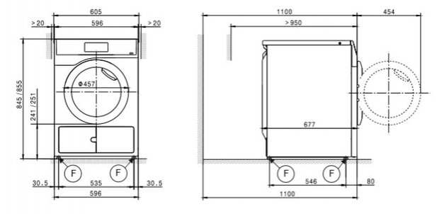 Ширину сушильной машины следует учитывать при любом варианте установки. Стандартное значение этого показателя составляет 59-60 см: такие устройства подходят для установки в колонну со стиральными или бок-о-бок с ними, а также для встраивания под столешницу или в кухонную тумбу. Они являются наиболее востребованными благодаря достаточно большому весу загрузки. Наименьшая ширина сушилок составляет 55-56 см, а максимальное значение этого параметра достигает 70 см. Самой большой шириной отличаются модели для профессионального использования, рассчитанные на увеличенный вес загрузки.