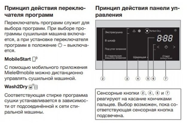 Элементы на панели управления сушильной машины служат для выбора программы сушки, для регулировки параметров работы, для задания дополнительных опций. Большинство сушильных маши оборудовано поворотными переключателями: с их помощью можно легко выбирать программу сушки — по остаточной влажности, по типу ткани, по виду изделий, по времени. Кнопки предназначаются для добавления к программе дополнительных опций: они могут быть как обычными, так сенсорными — в последнем случае все варианты выбора отображаются на дисплее, и возможности управления становятся более удобными и гибкими.