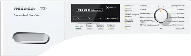 Машина оснащена экономичной конденсационной сушкой с тепловым насосом. Панель управления с наклоном 5? содержит однострочный дисплей и поворотный переключатель для выбора программы. При помощи сенсорных кнопок и таймера можно задать дополнительные параметры или отложить старт на удобное время — максимум на 24 часа. На дисплее отображается информация о выбранной программе, времени до завершения цикла, активных опциях. Система умной сушки включает функцию реверса барабана при дисбалансе и функцию контроля за расходом электроэнергии EcoFeedback. Конденсат сливается в большую емкость, имеется также встроенная система его отвода в канализацию.