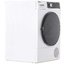 В барабан единовременно можно загрузить 8 кг. Его реверсивное вращение предотвращает сбивание вещей в ком и образование дисбаланса. Подсветка — не только красивая, но и функциональная деталь, так как дает хороший обзор, как проходит сушка. Цвет корпуса — белый.