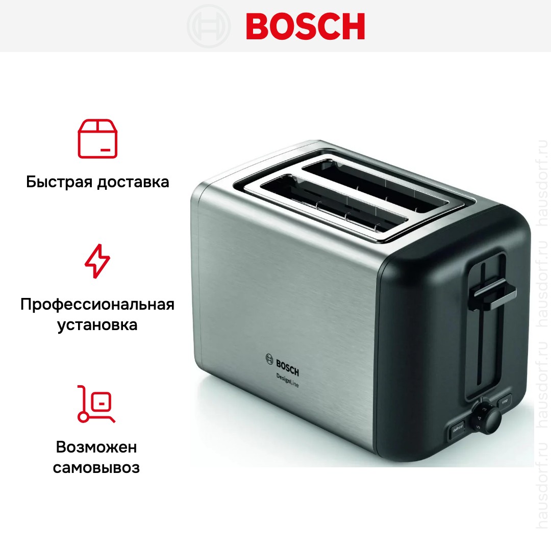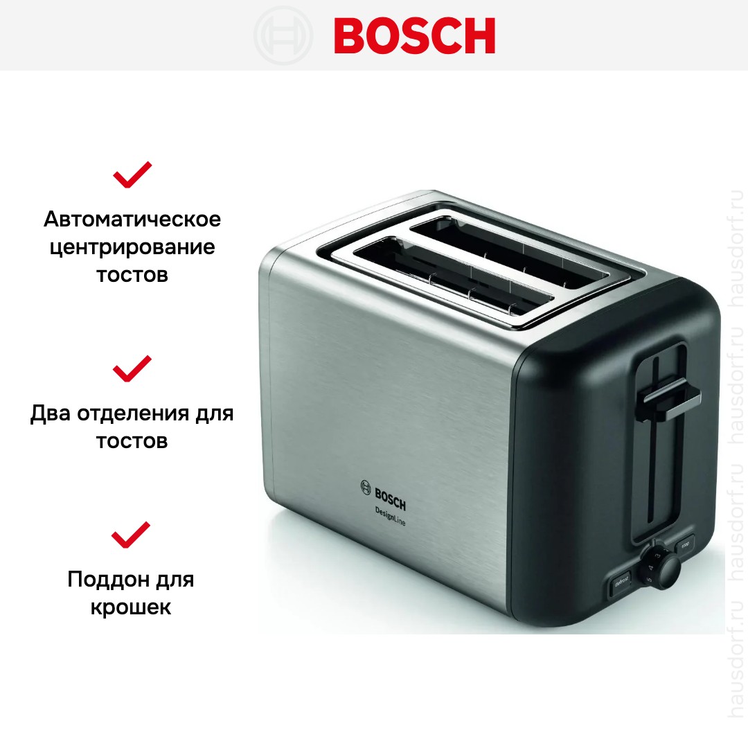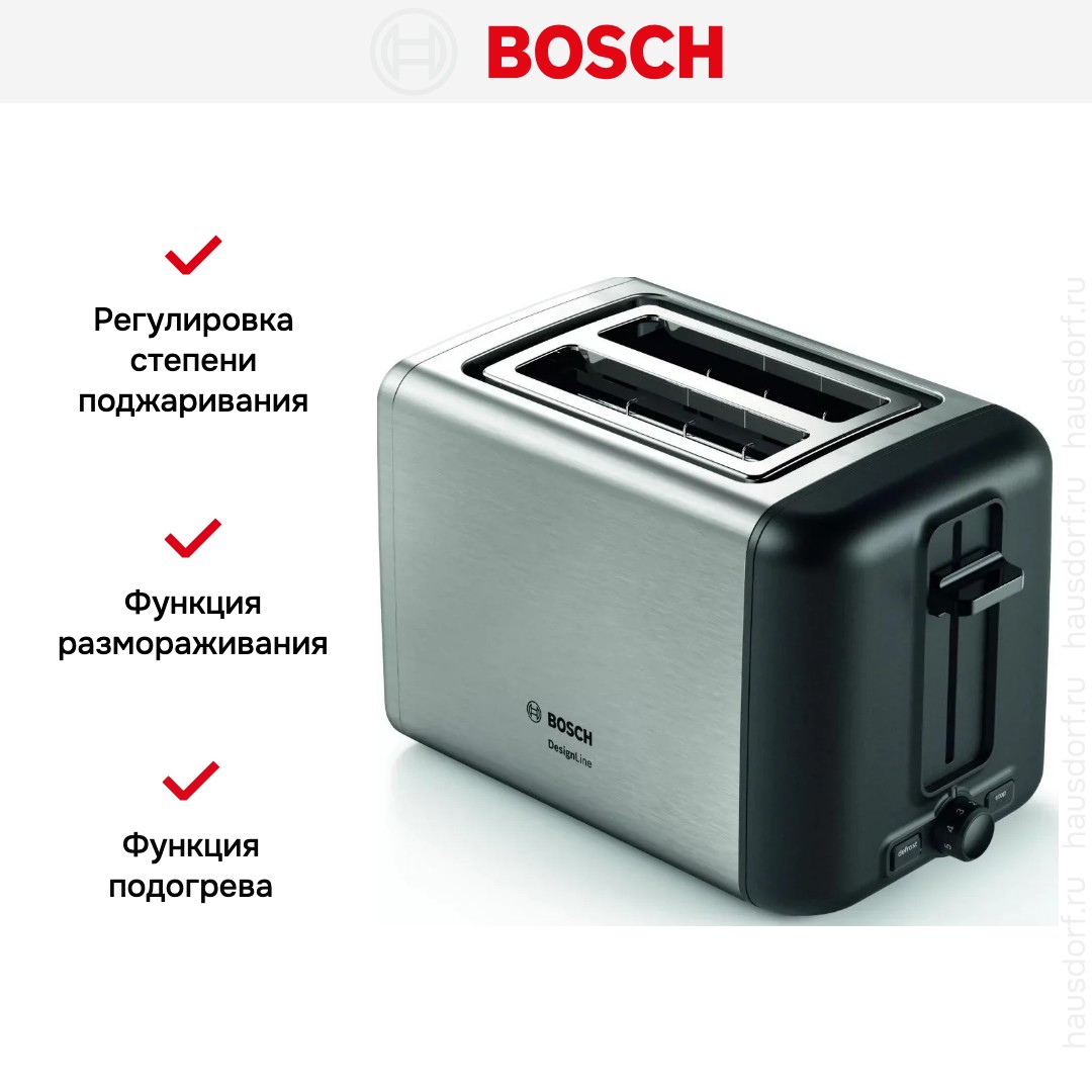 Стильный тостер Bosch имеет компактный корпус на устойчивых ножках, благодаря которым не пошатывается, даже если хлеб выпрыгивает вверх в конце приготовления. Основной материал, из которого изготовлен прибор, — нержавеющая сталь. Его главный оттенок — нержавеющая сталь. Простое и понятное механическое управление позволяет быстро разобраться во всех функциях. Простое и понятное электронное управление позволяет быстро разобраться во всех функциях. На корпусе расположены кнопочные+поворотные переключатели для изменения настроек.